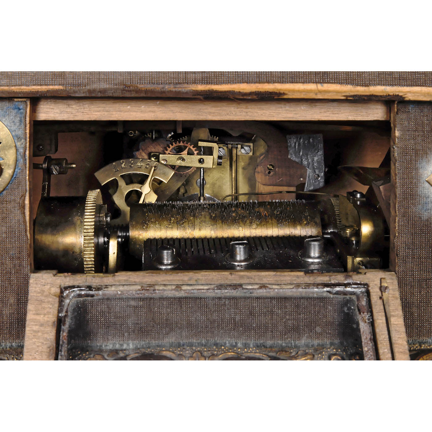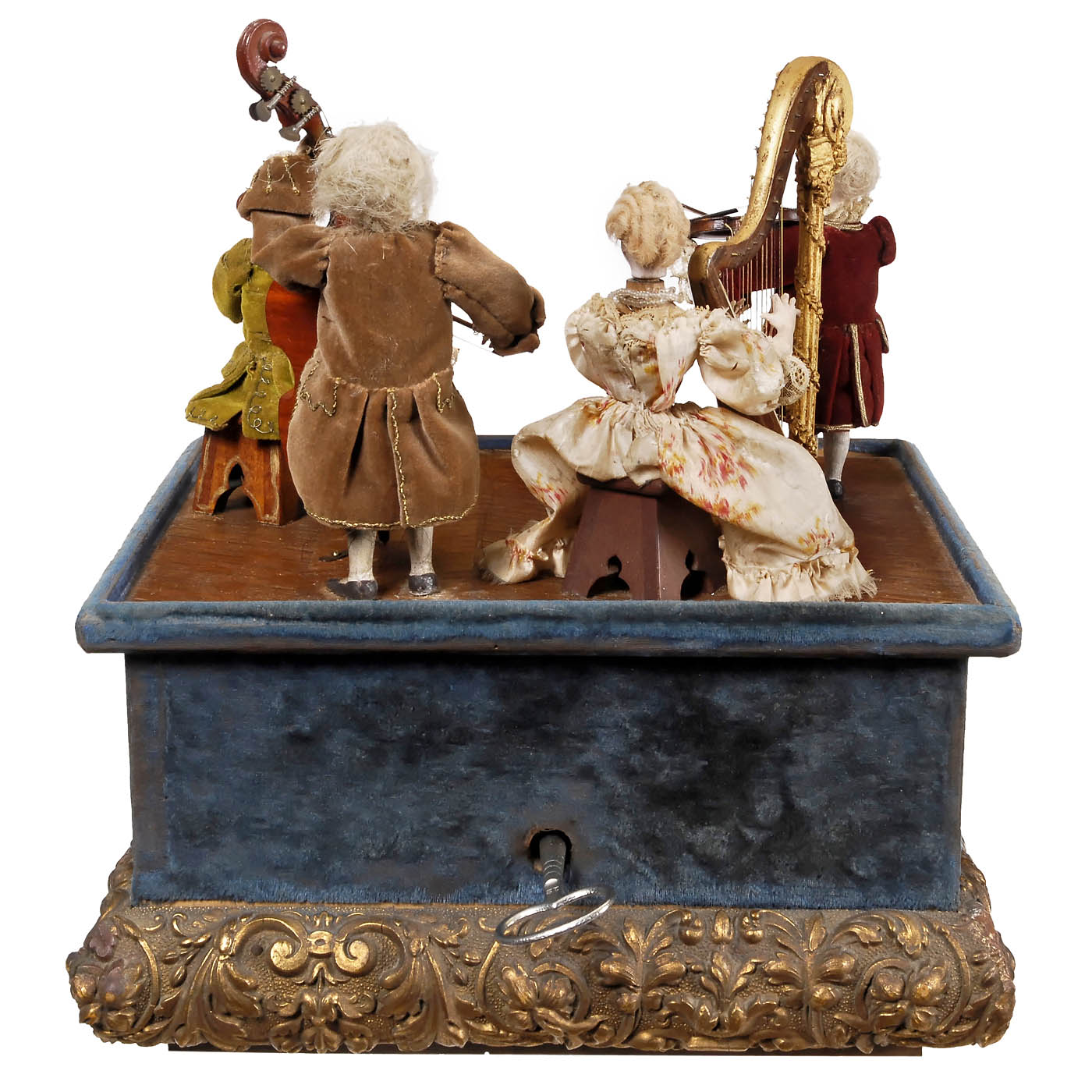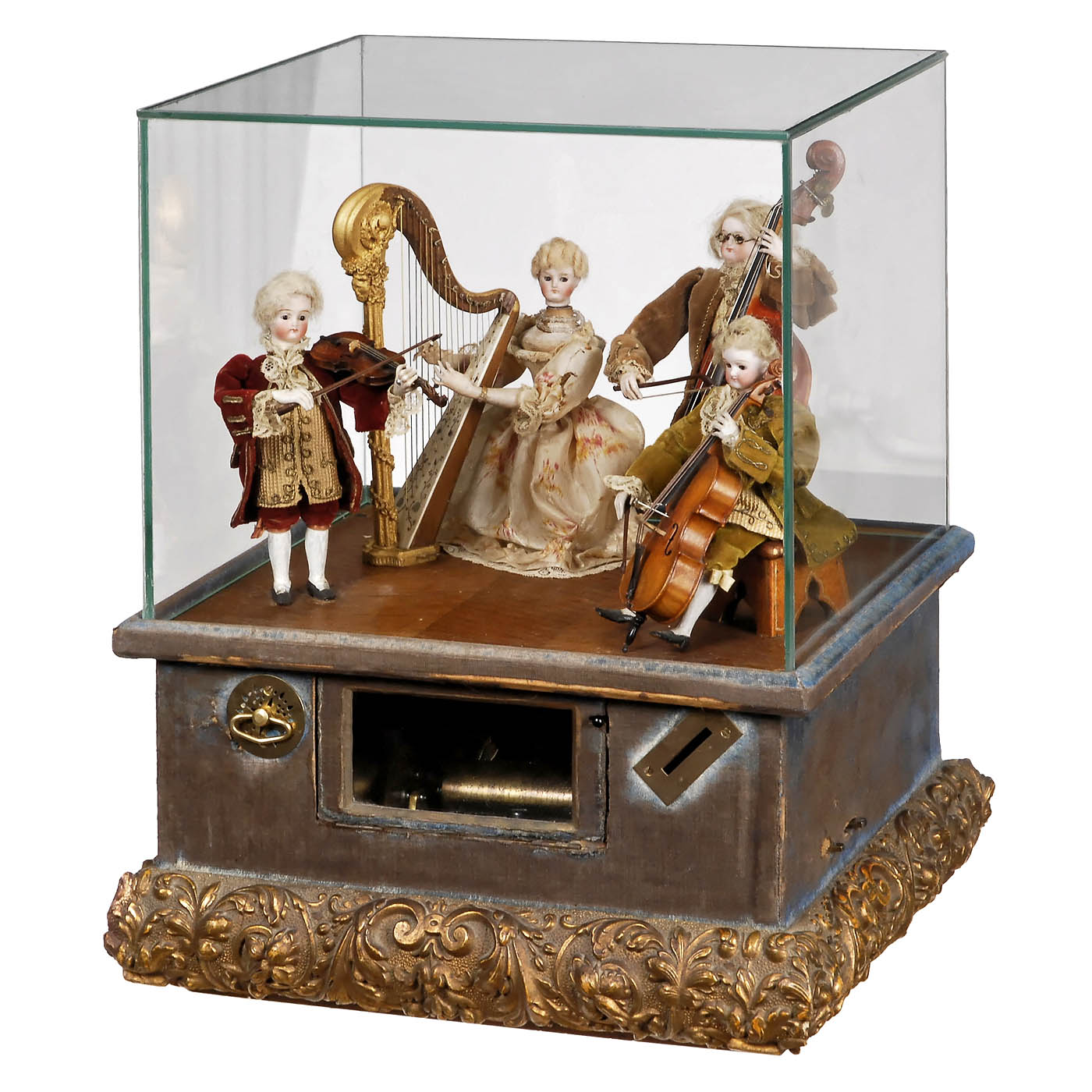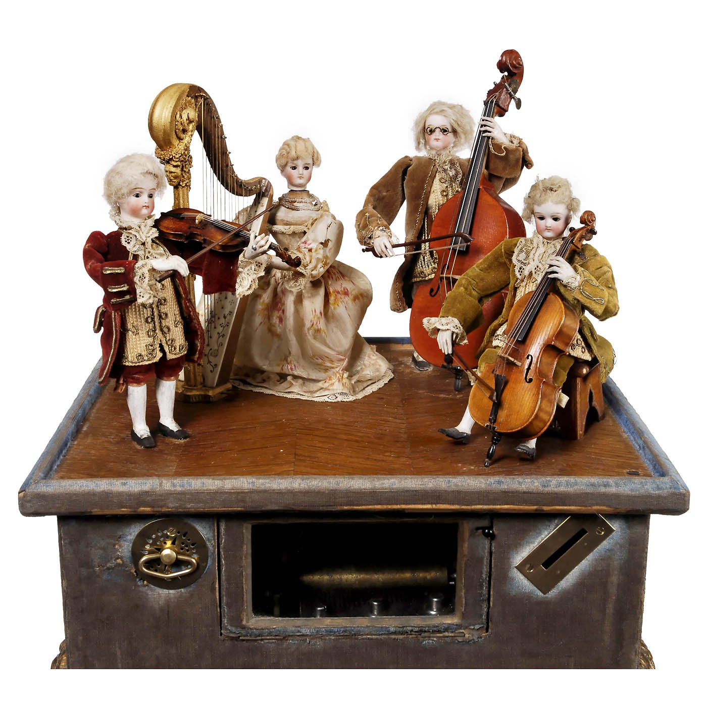 In 19th century style using antique and modern parts, the figures with German bisque heads, closed mouths, fixed glass eyes, carved wood limbs and silk and velvet costumes trimmed with lace and metal-thread, playing harp, cello, violin and double bass, on velvet-covered wood base containing rod-wound six-air cylinder movement and key-wind motor activating the left or right arms of the male figures and both arms of the harpist, under glass cover, ht. including cover 16 ¼ x wd. 13 in. (41,5 x 33 cm), tallest figure 6 ½ in. (16 cm), working and playing condition. With steel key.