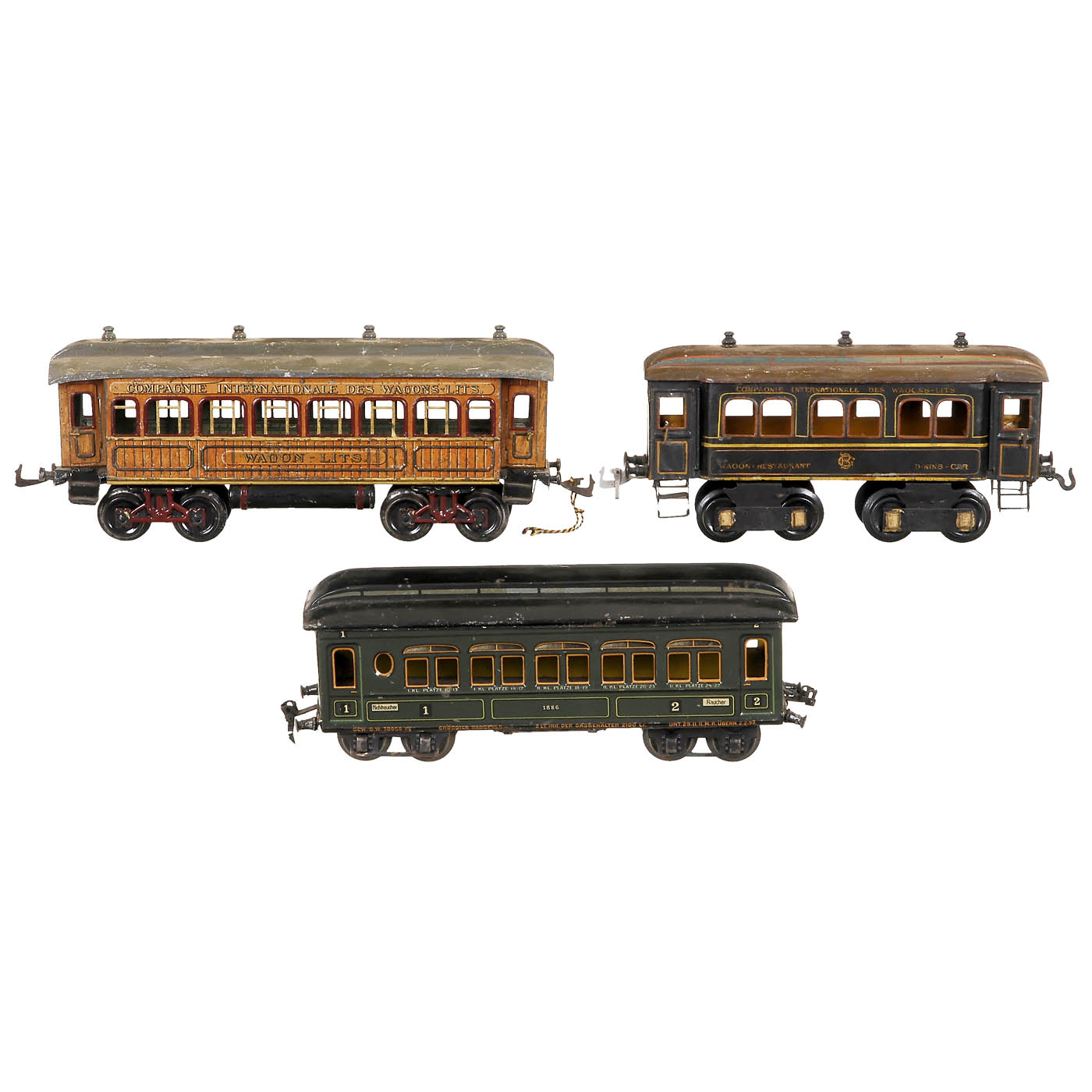 1) Märklin 1886/1, length 12 4/5 in. - 2) Gebrüder Bing, dining car, length 11 in. - And: 3) Gebrüder Bing "Wagon-Lits", length 13 in.