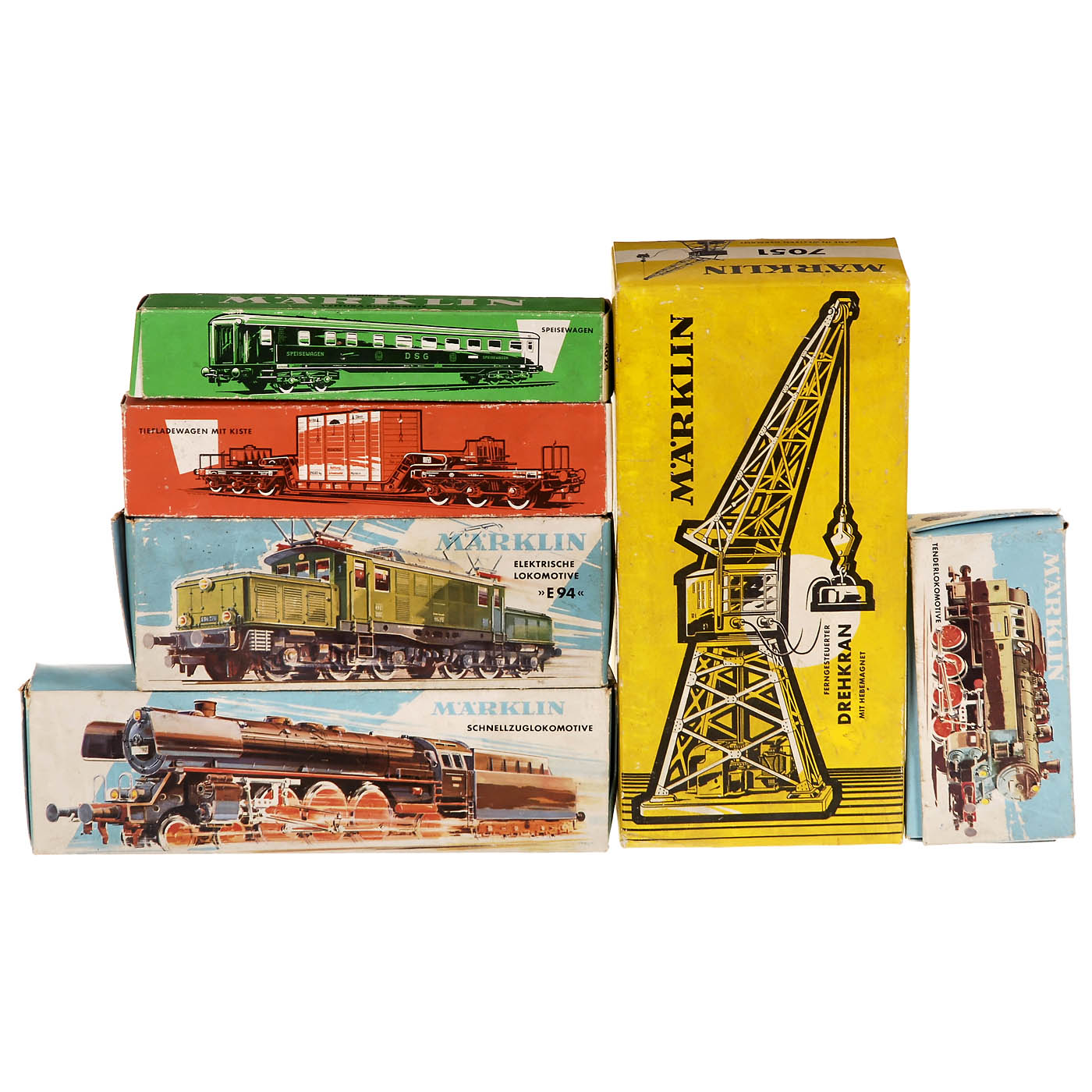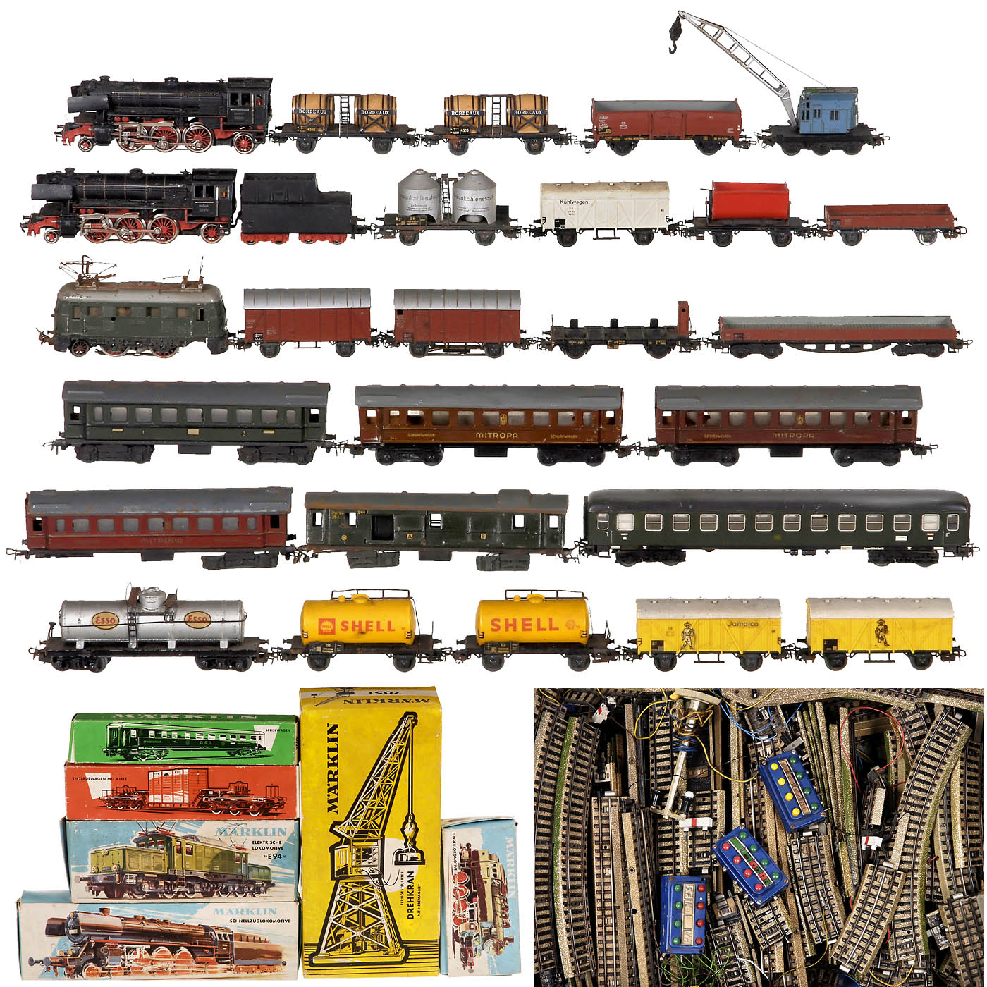 1) Fast train locomotive BR 01, no. 3048, in box. - 2) Electric locomotive E94, no. 3022, in box. - 3) Tender locomotive BR 81, no. 3031, in box. - 4) 2 x fast train locomotive BR 23, no. 3005 (1 x without tender). - 5) Electric locomotive, no. ES 800, not complete. - 6) 5 passenger, sleeping and dining cars, no. 341, 342 and 343 (partly incomplete). - 7) 20 passenger and freight wagons. - 8) Crane, no 7051, missing magnet, in box. - And: 9) Approx. 100 rails and switches, some with continuous center conductors. - Attractive lot for hobbyists and collectors.