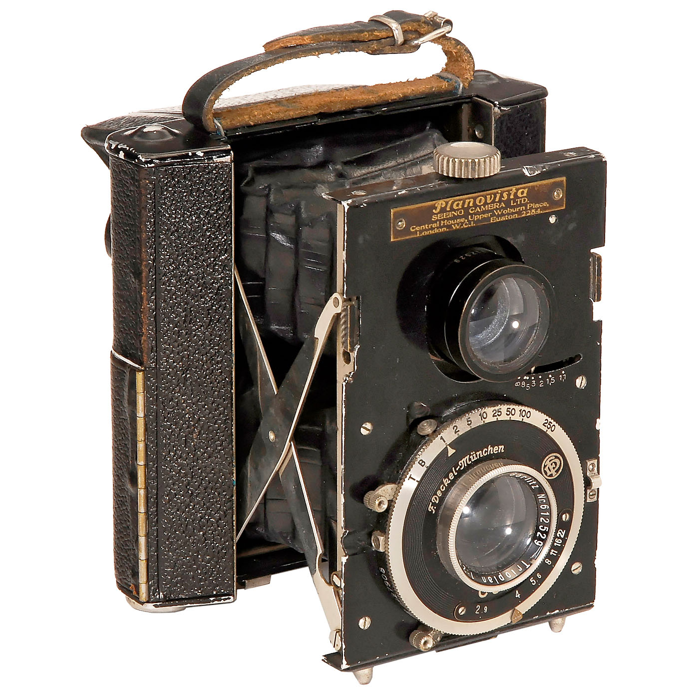 Bentzin for Planovista Seeing Camera Co. Ltd., London. Rare export version of the Primarette, TLR camera, 4,5 x 6 cm on rollfilm type 127, Trioplan 2,9/7,5 cm in Compur, strut construction. – Rare!