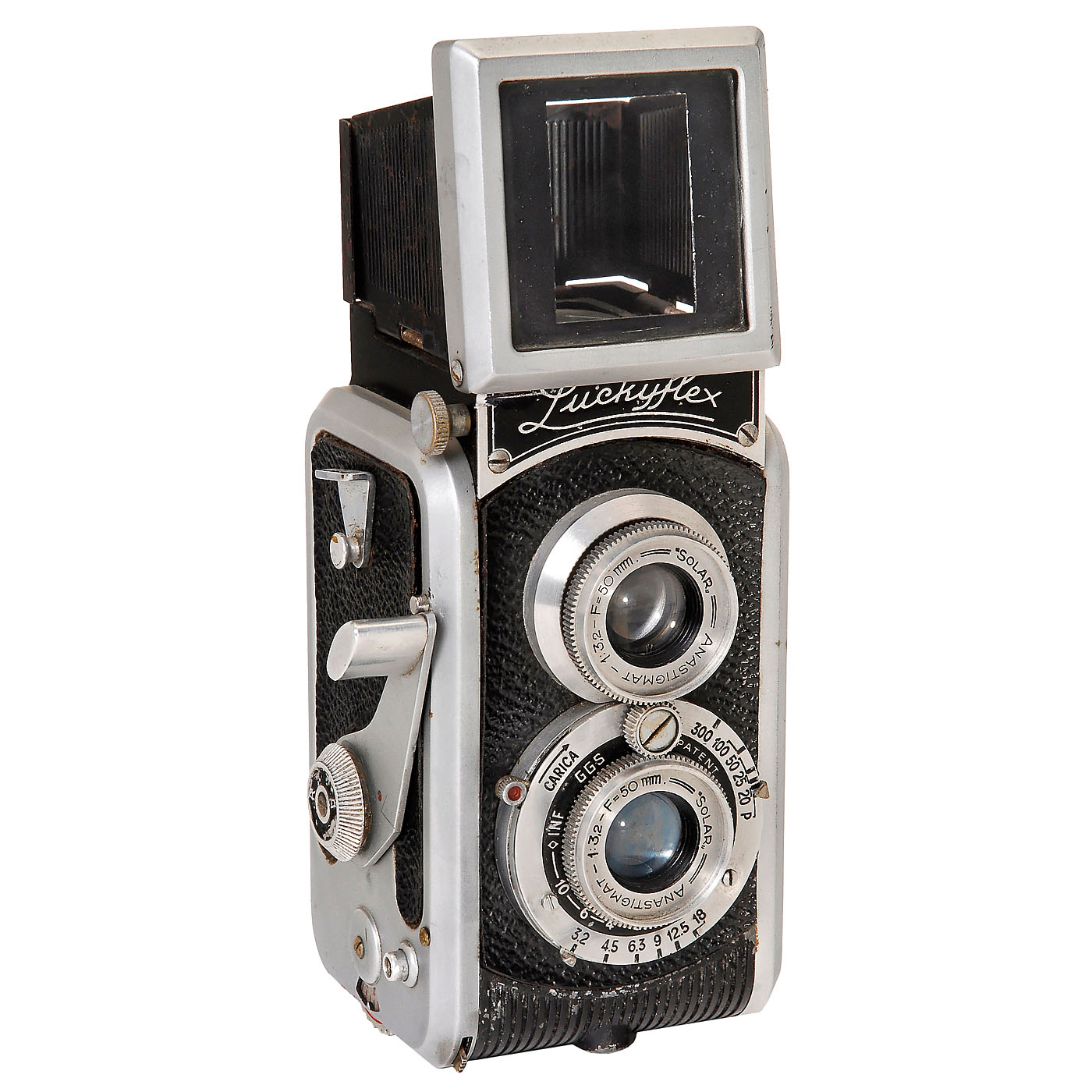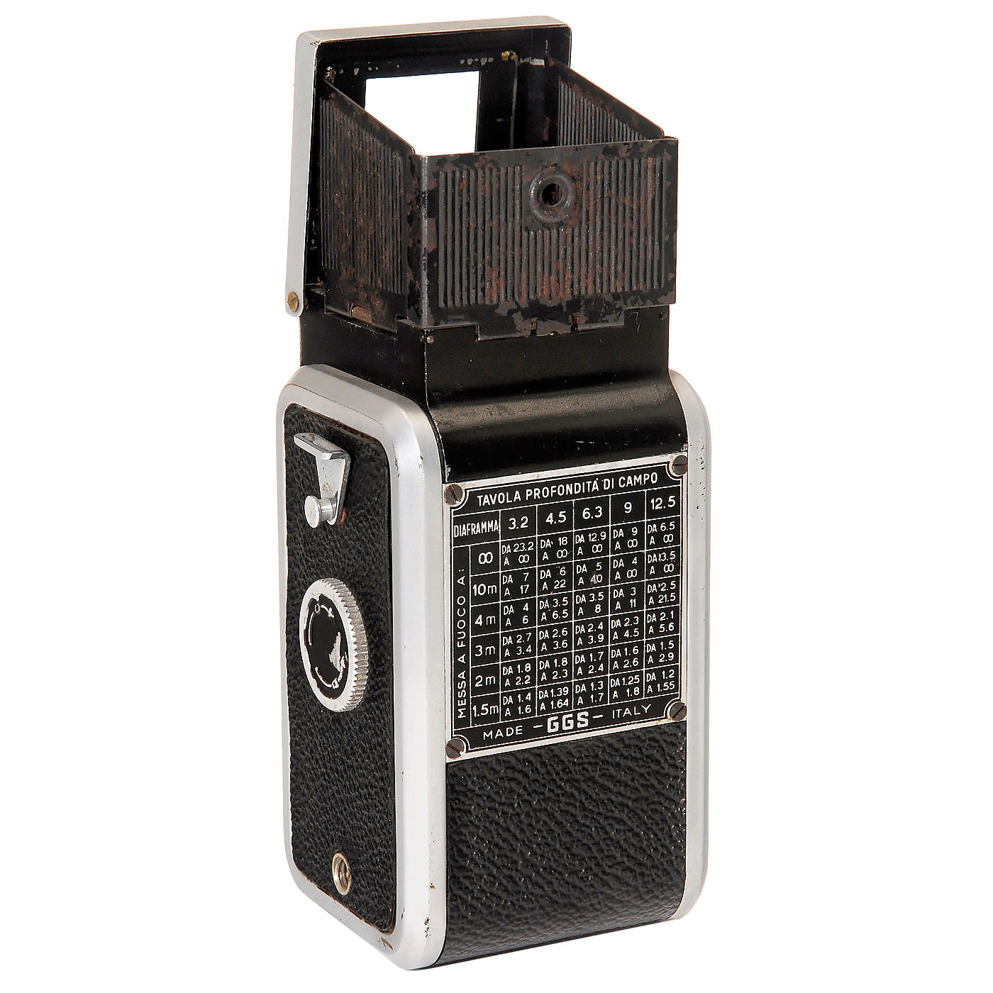 G.G.S., Italy. TLR camera for 35mm film, size 24 x 36 mm, Solar-Anastigmat 3,2/50 mm, shutter 1/20–1/300 sec. (sluggish). – A very rare TLR-35mm camera!