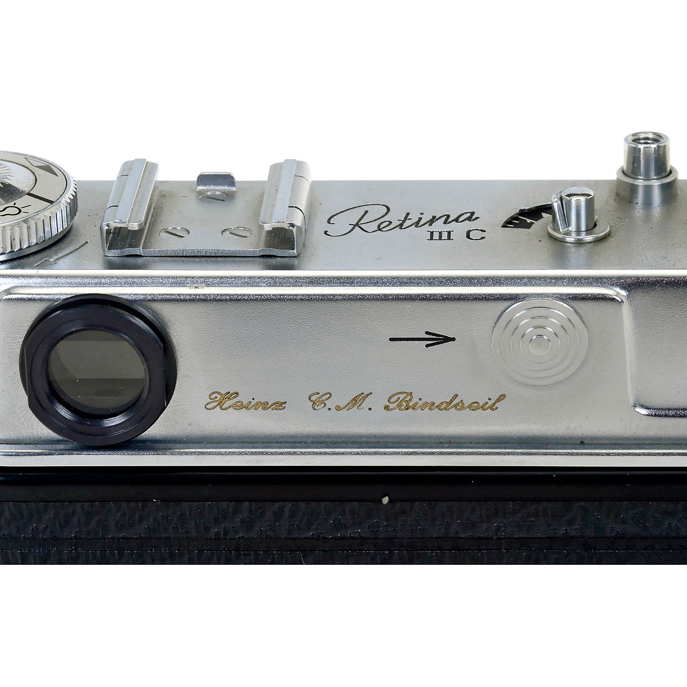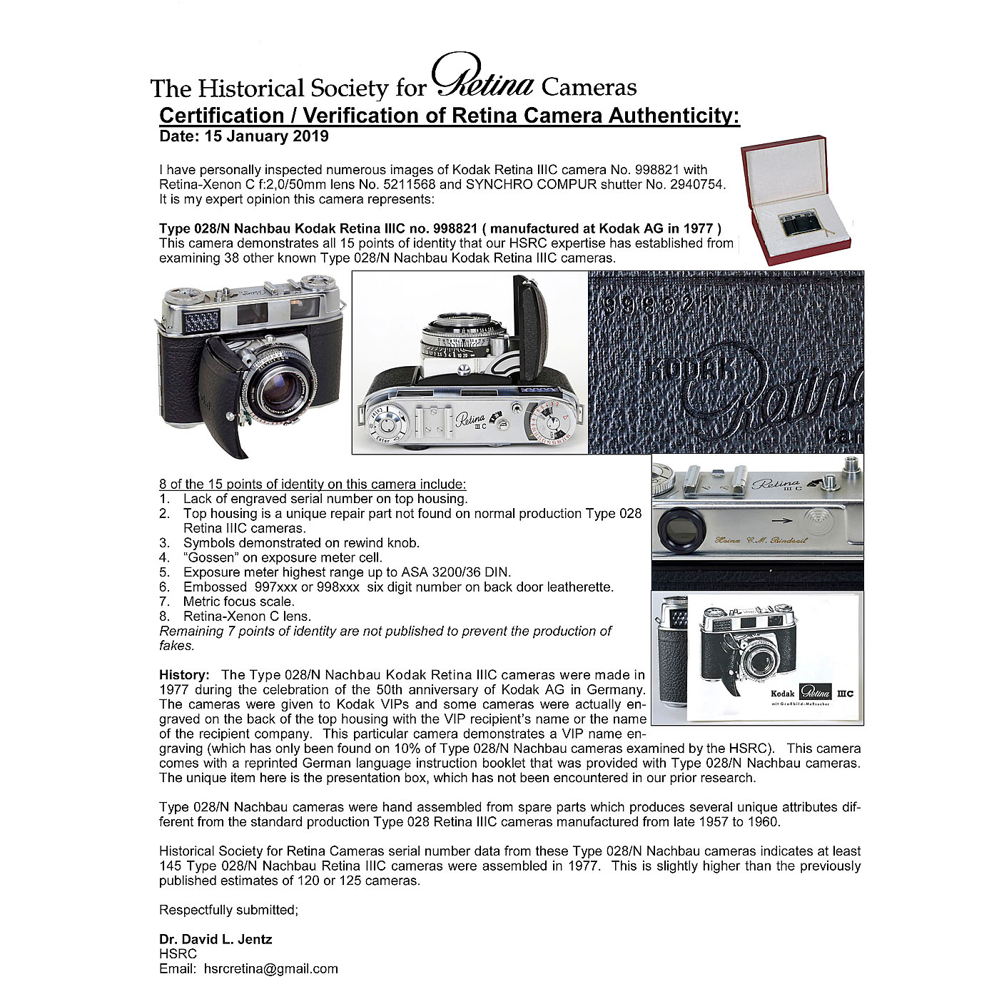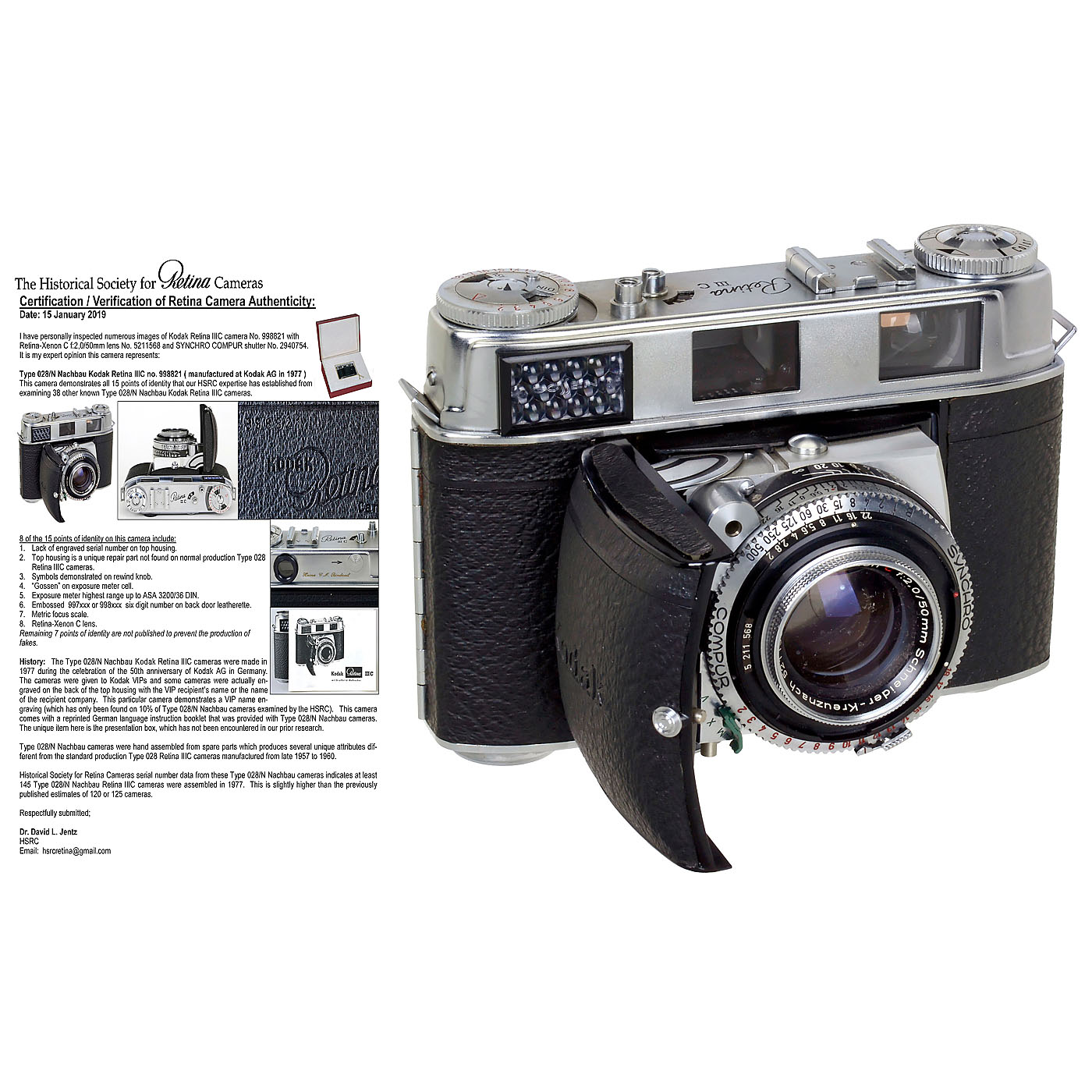 Kodak AG, Stuttgart. Example of the legendary "Nach bauserie" of approx. 150 cameras in 1977 for the 50th anniversary of Kodak AG in Germany. Special serial no. 998821 in backdoor leather and engraving of the recipient's name on top plate. Never used, absolutely mint condition, with "Nachbau" instruction book, in beautiful presentation case. With "Certificate of Authenticity" from the HSRC (Historical Society for Retina Cameras) in the USA.