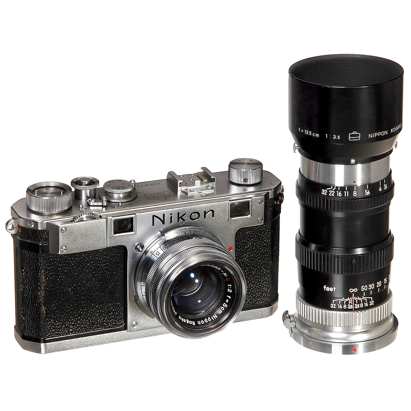 Nippon Kogaku, Tokyo. No. 6120677, chrome, Nikkor-H.C 2/5 cm, no. 639450. – And: Nikkor-Q 3,5/13,5 cm, with lens hood.