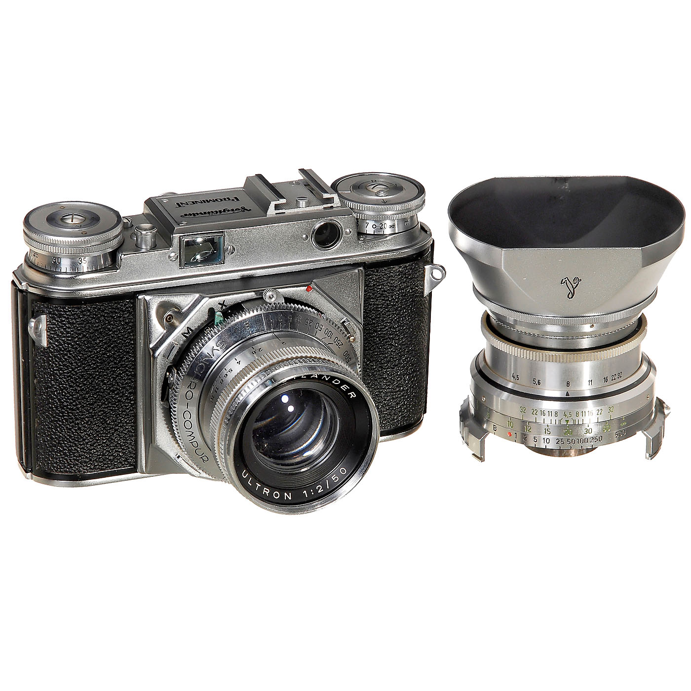 Voigtländer, Braunschweig. No. B74541, second model (with lever wind), Ultron 2/50 mm, Synchro-Compur (currently not working). With Dynaron 4,5/100 mm, lens hood.