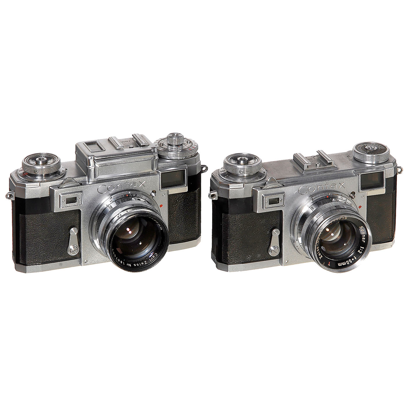 Zeiss Ikon, Stuttgart. 1) Contax IIa, 1950, no. V 15415, Zeiss-Opton Sonnar 2/50 mm, no. 708715, coating with spots. (3/2) – And: 2) Contax IIIa, 1954, no. B 99421, Sonnar 1,5/50 mm, no. 1887083, light meter working. (2-/2+)