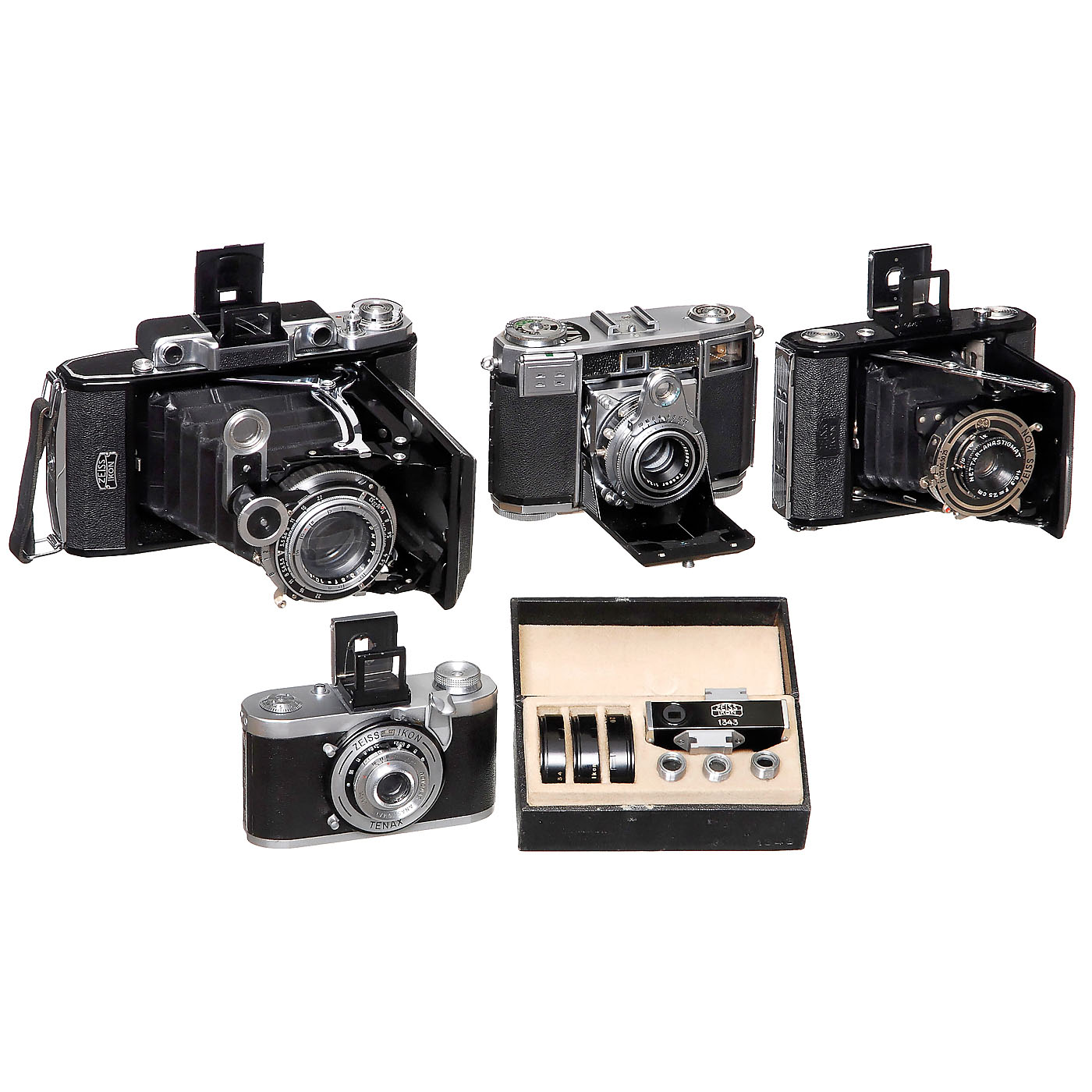 1) Super Ikonta 531/2, No. M 60998, 1951, size 6 x 9 cm, Novar-Anastigmat 3,5/10,5 cm. (2-/2) – 2) Nettar 515, no. H 39708, size 4,5 x 6 cm, Novar-Anastigmat 6,3/7,5 cm in Telma. (2/2) – 3) Zeiss Contessa 35 (533/24), c. 1953, No. Q 54691, Zeiss-Opton Tessar 2,8/45 mm. (3+/3) – 4) Tenax I (Soviet zone), 1948, No. 5094183, Novonar Anastigmat 3,5/35 mm. – In addition: Zeiss Contameter 1343, complete in case, for Contax I–II.