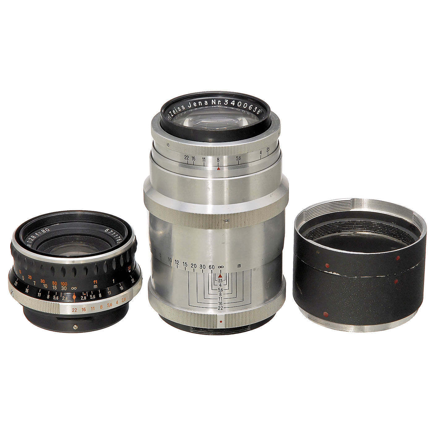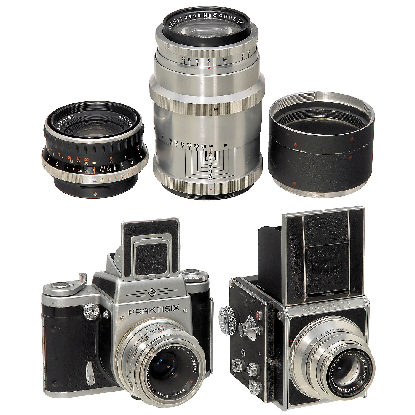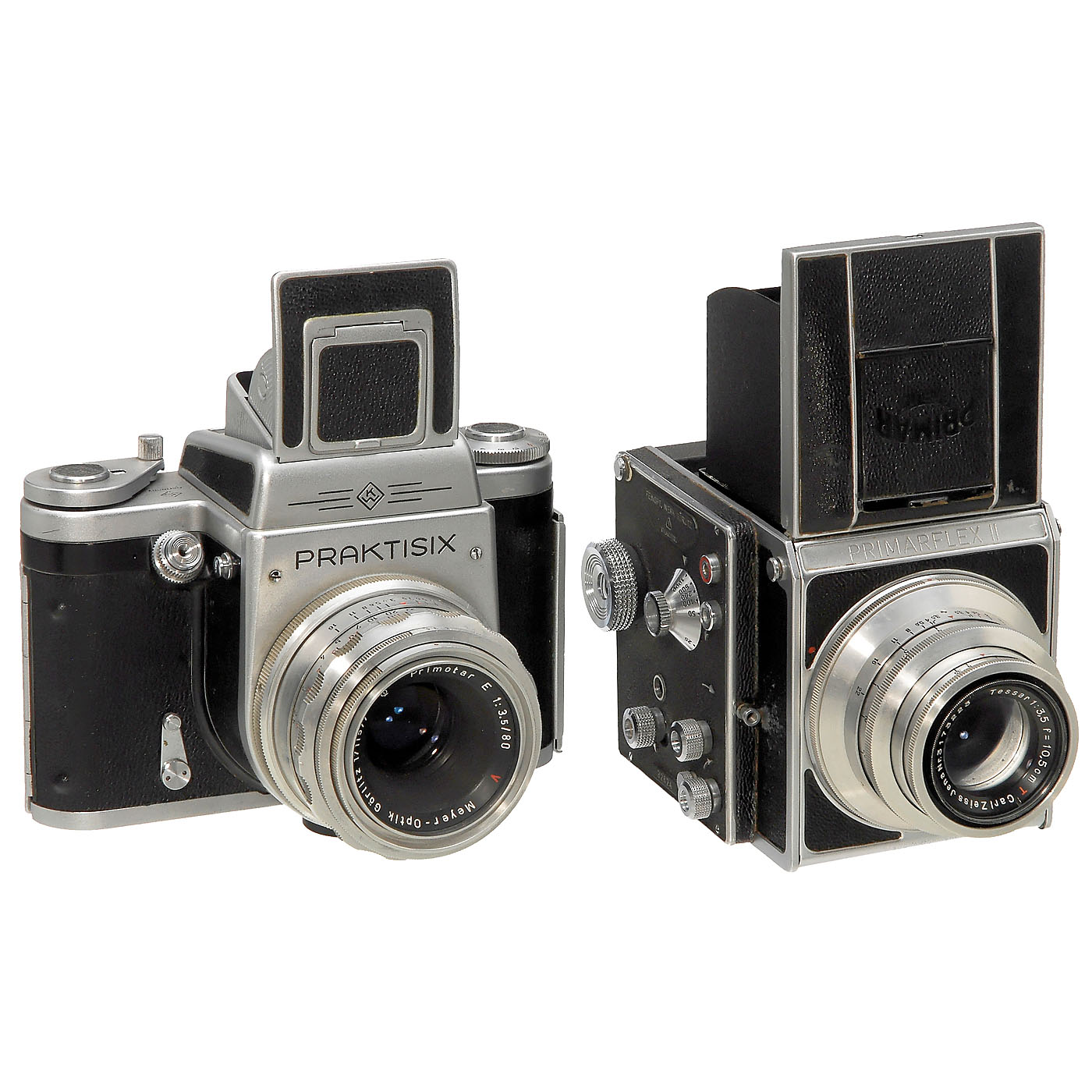 1) Feinopt. Werk Görlitz (vorm. Curt Bentzin). Primarflex II, 1953, SLR 6 x 6 cm, focal plane shutter stuck, body no. 32624, Tessar 3,5/10,5 cm T, no. 3173223. – In addition: Tessar 3,5/16,5 cm T, no. 3400638 and extension ring. (2–3/4) – And: 2) Kamera-Werkstätten (KW), Dresden. Praktisix, c. 1957, SLR 6 x 6 cm, focal plane shutter working, with Primotar E 3m5/80 mm and BM 2,8/80 mm. (3–2/2-)