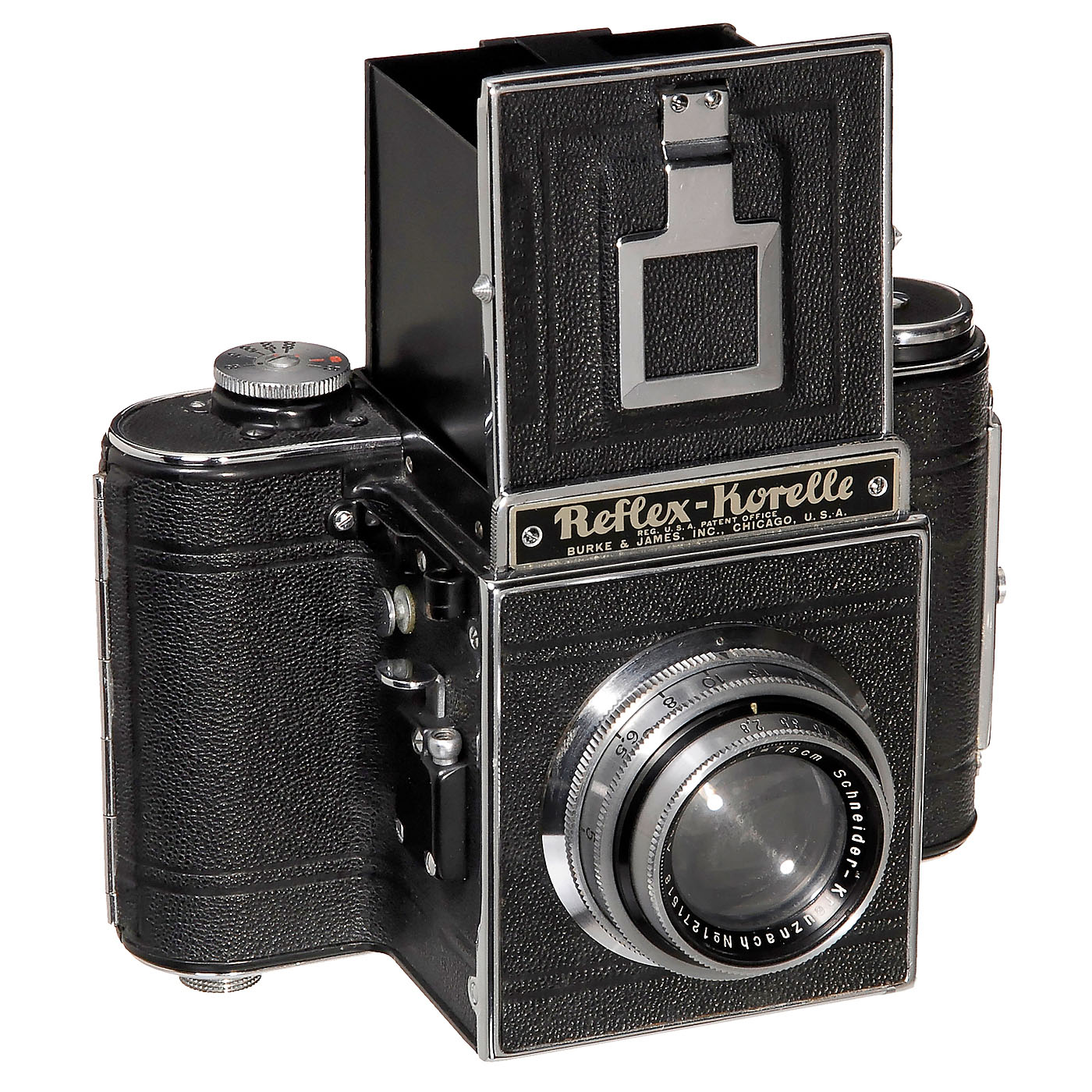 Kochmann, Dresden. Export version with text in script, on black nameplate: "Reflex-Korelle Burke & James, Inc., Chicago, U.S.A.", Schneider Xenar 2,8/7,5 cm, no. 1271518, distance scale in feet, shutter speeds 1/25–1/500 sec., shutter with problems – Outer body in excellent condition!