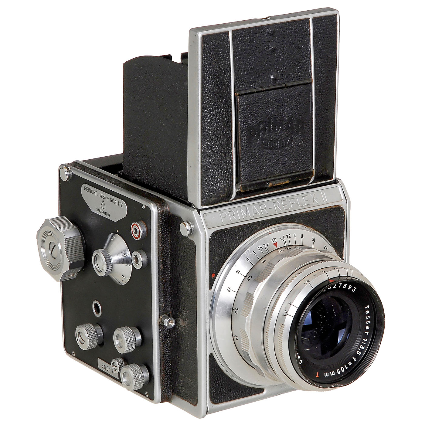 Feinopt. Werk Görlitz (vorm. Curt Bentzin). No. 36017, late version, final serial no. 36228, SLR 6 x 6 cm, focal plane shutter (stuck). With Tessar 3,5/105 mm T, no. 3527693. – Very good condition.