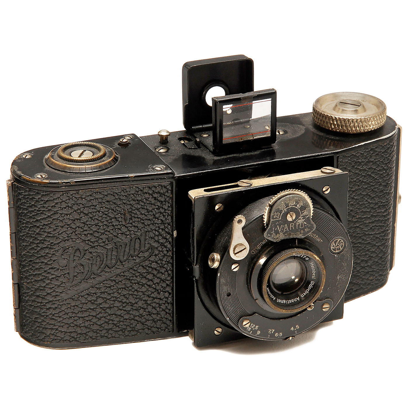 Kamera-Fabrik Waldemar Beier, Freital, Germany. 35mm camera, size 3 x 4 cm, first version with folding viewfinder, Steinheil Actinar 4,5/5 cm in Vario, strut construction. – Rare camera!