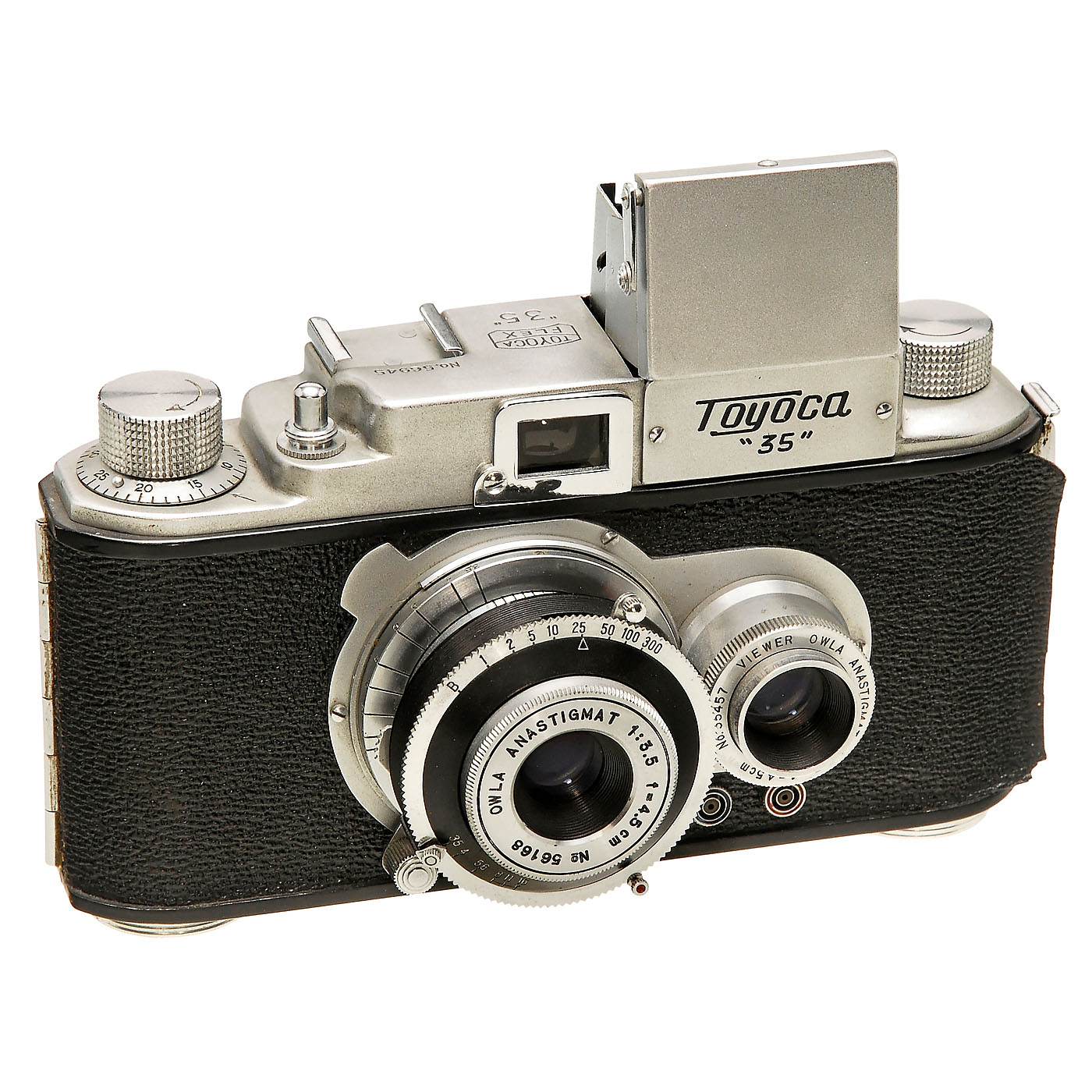 Tougo-do Manufacturing, Japan. No. 56945, 35mm TLR camera with direct and reflex finder, Owla Anastigmat 3,5/4,5 cm in Toyoca shutter 1–1/200 sec. Leather on two corners lose, everything else in excellent condition!