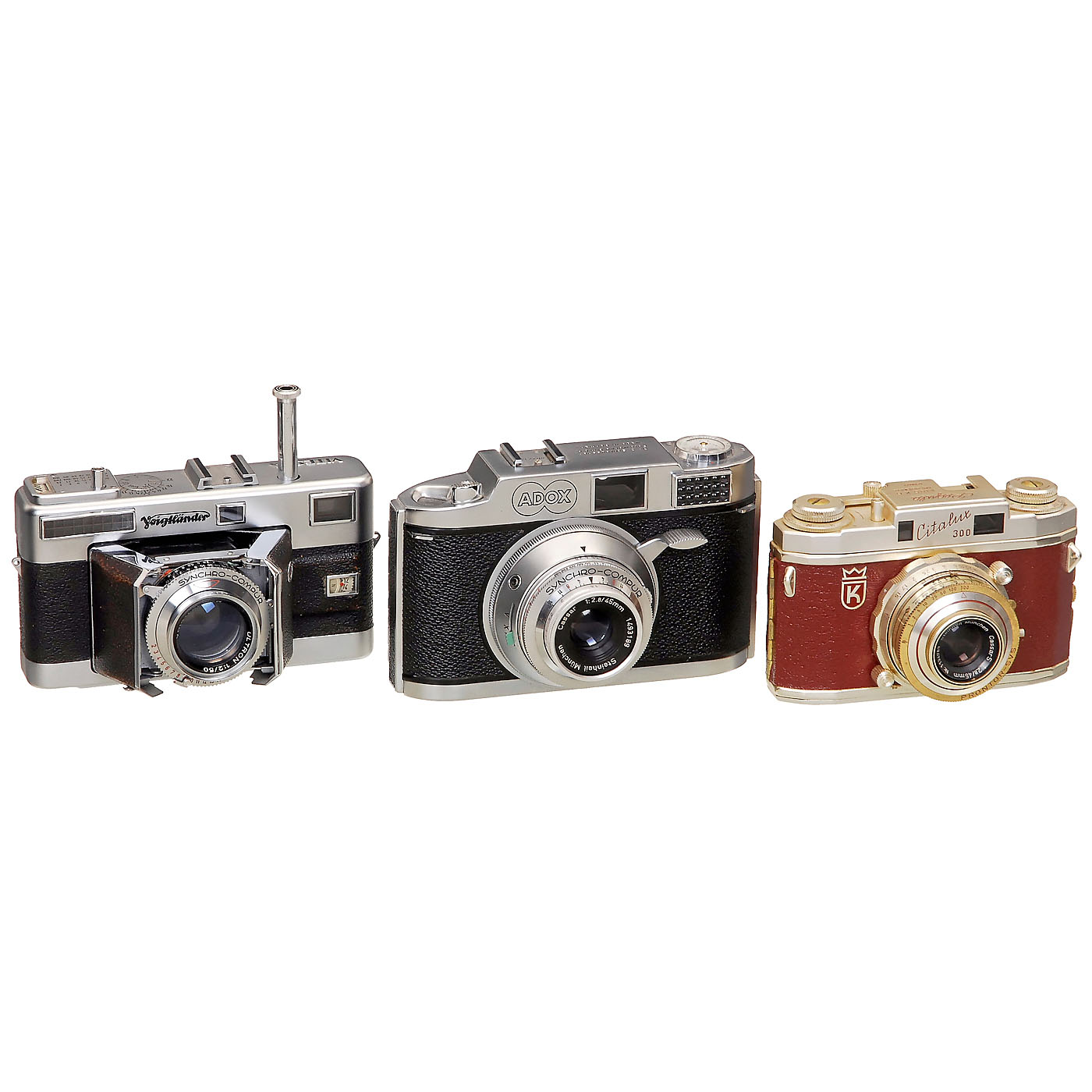 1) Adox – Dr. C. Schleussner, Wiesbaden. Adox 300, 1957, no. 002232, Cassar 2,8/45 mm in Synchro-Compur, long shutter speeds sluggish, light meter not working, body in near-mint condition. (1-/3) – 2) Regula-Werk King, Bad Liebenzell. Citalux 300, 1956, Cassar S 2,8/45 mm in Prontor-SVS, luxury version, red leather and gold trim. (3–2/2) – And: 3) Voigtländer. Vitessa L, 1954, Ultron 2/50 mm in Synchro-Compur, feet scale. (2–3/2)