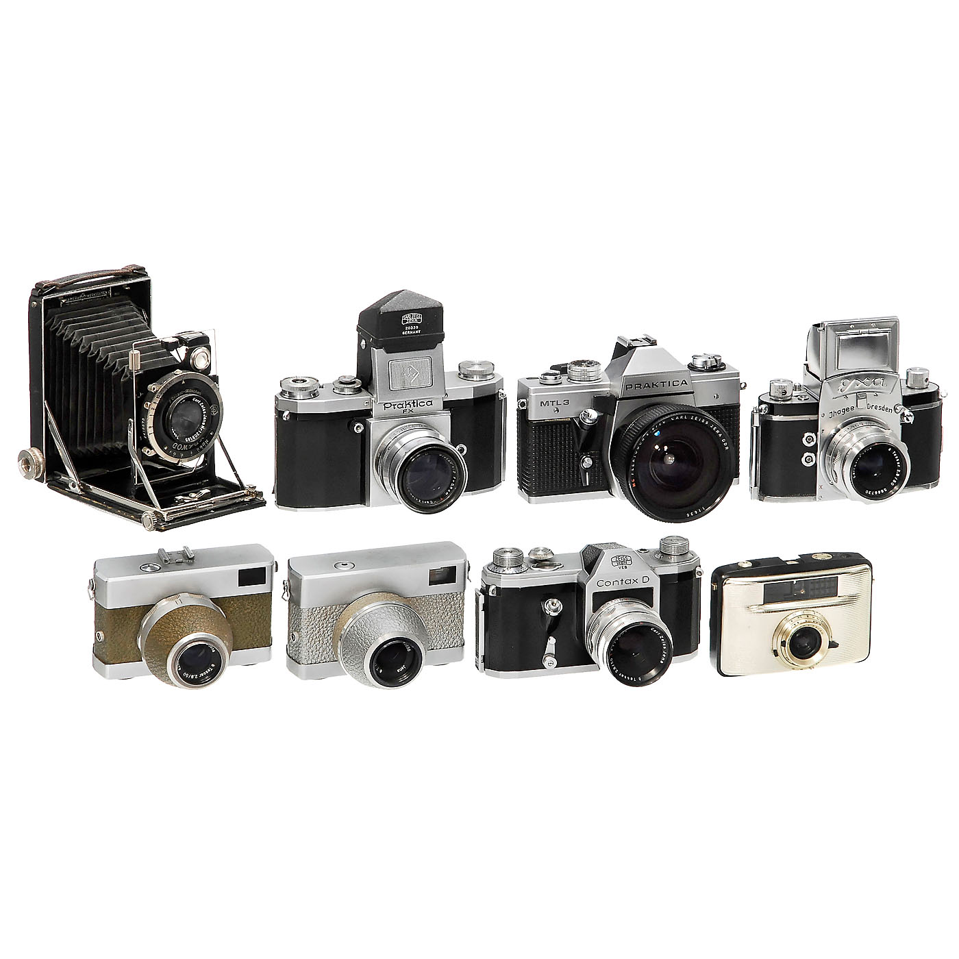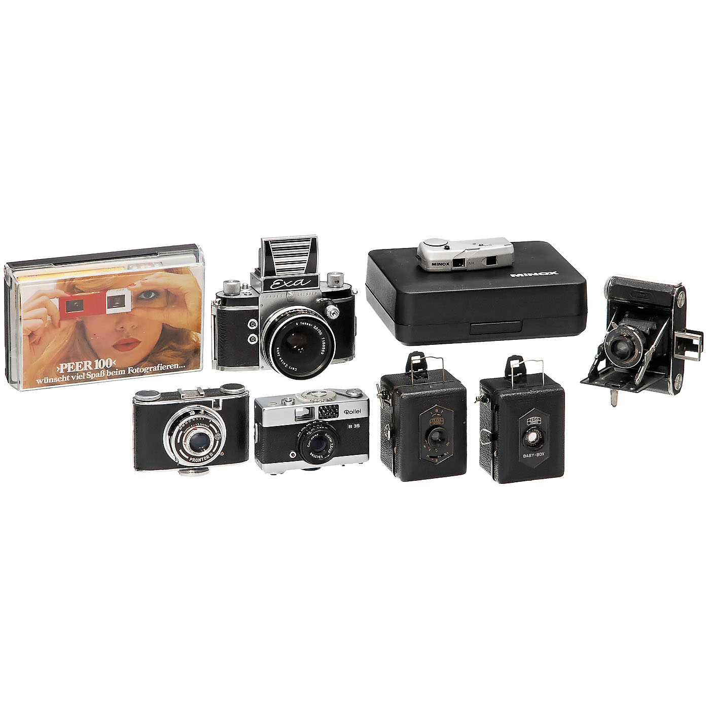 Patent Etui 6,5 x 9 cm, Ikonta 520/18, Rollei B35 (Germany), Praktica MTL 3 with Flektogon 2,8/20 mm, Ising Puck, spy camera "Peer 100", 2 x Zeiss Baby-Box (different models), Minox 35GT with flash, 2 x Werra (different models), Lomo LC-A, Carena 126 sport, Penti (gold), Contax D (large "D"), near-mint (!), 2 x Exa, Minox MX, Praktica FX with prism viewfinder, accessories. – Not all pictured.