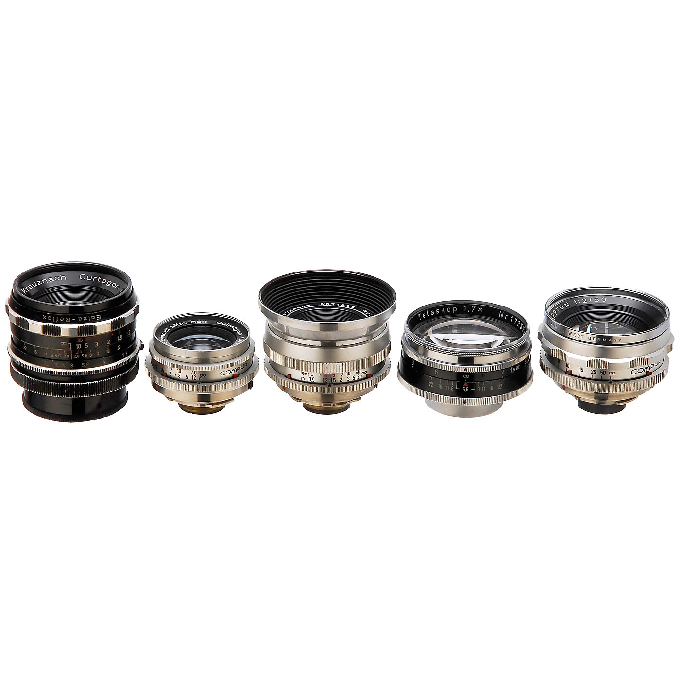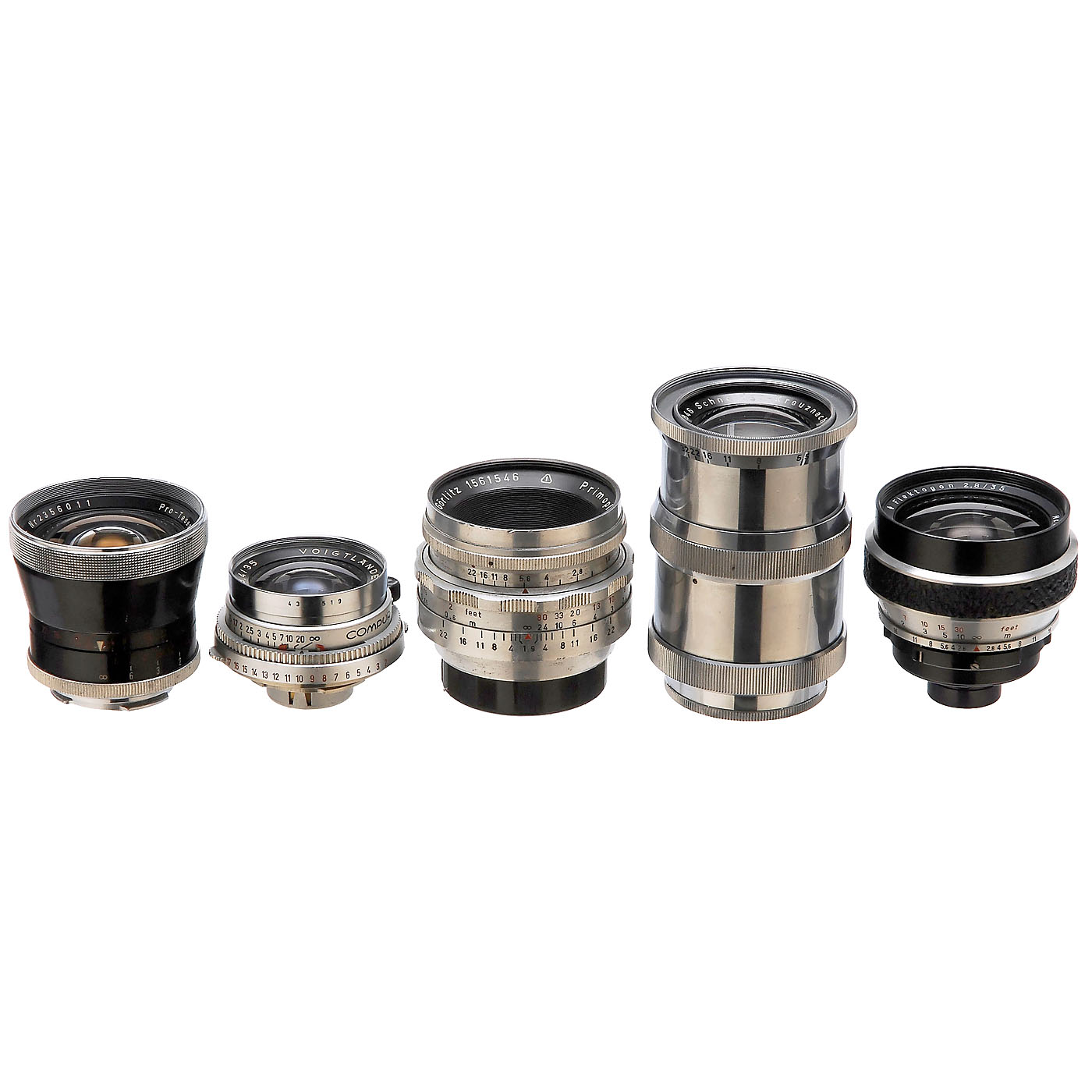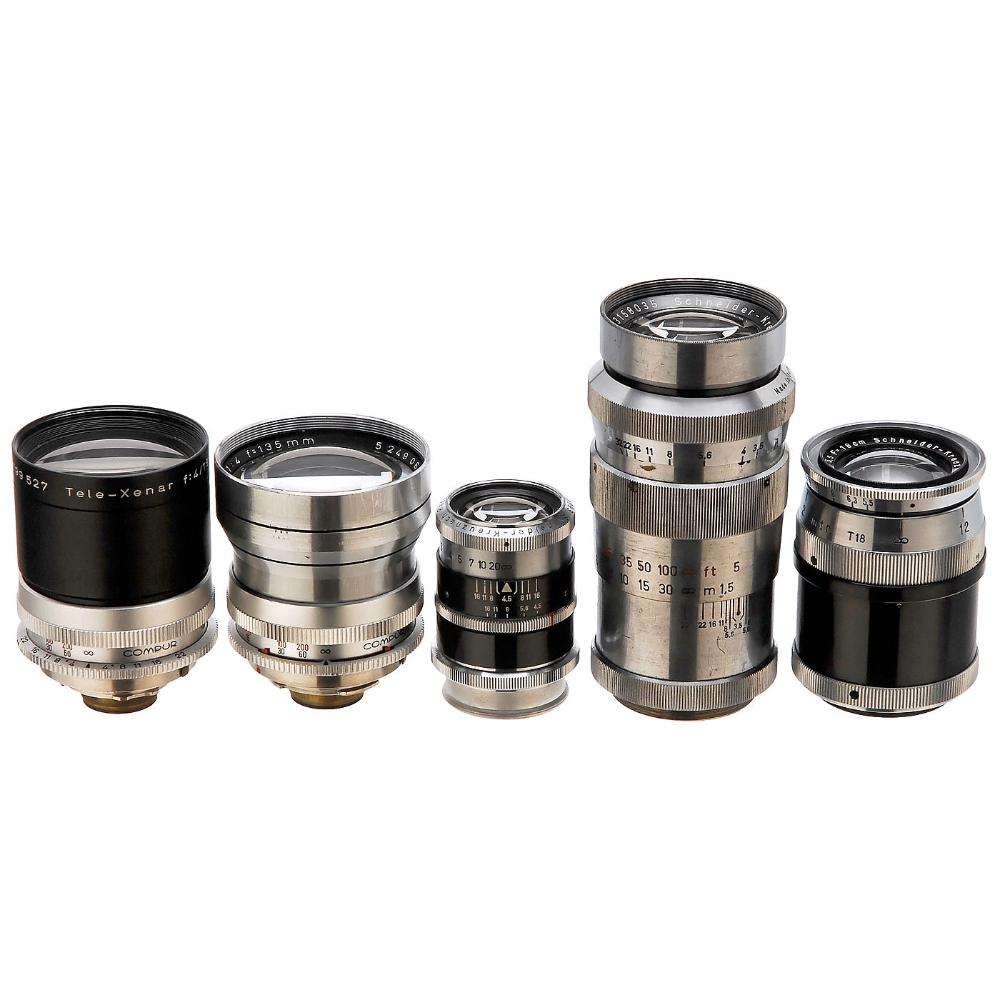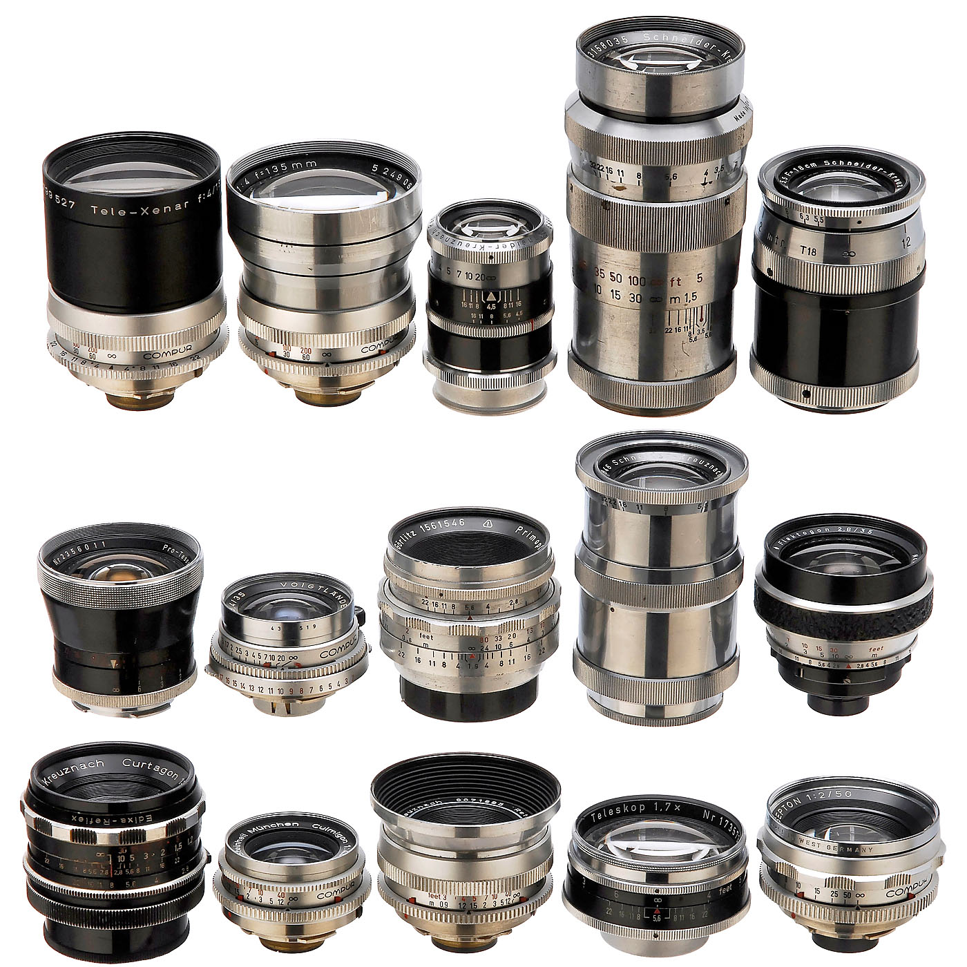 1) Schneider Tele-Xenar 4/135 mm. – 2) Rodenstock-Rotelar R 4/135 mm. – 3) Retina-Curtagon 4/28 mm. – 4) Culmigon 4,5/35 mm. – 5) Flektogon 2,8/35 mm. – 6) Voigtländer Septon 2/50 mm. – 7) Skoparex 3,5/35 mm. – 8) Pro-Tessar 4/35 mm. – 9) Zeiss Teleskop 1,7x. – 10) Schneider Tele-Xenar 5,5/18 cm. – 11) Schneider Xenar 3,5/135 mm. – 12) Schneider Tele-Xenar 5,5/180 mm. – 13) Primoplan 1,9/58 mm. – 14) Schneider Curtagon 2,8/35 mm. – And: 15) Schneider Radionar 4,5/75 mm. – Various camera mounts.