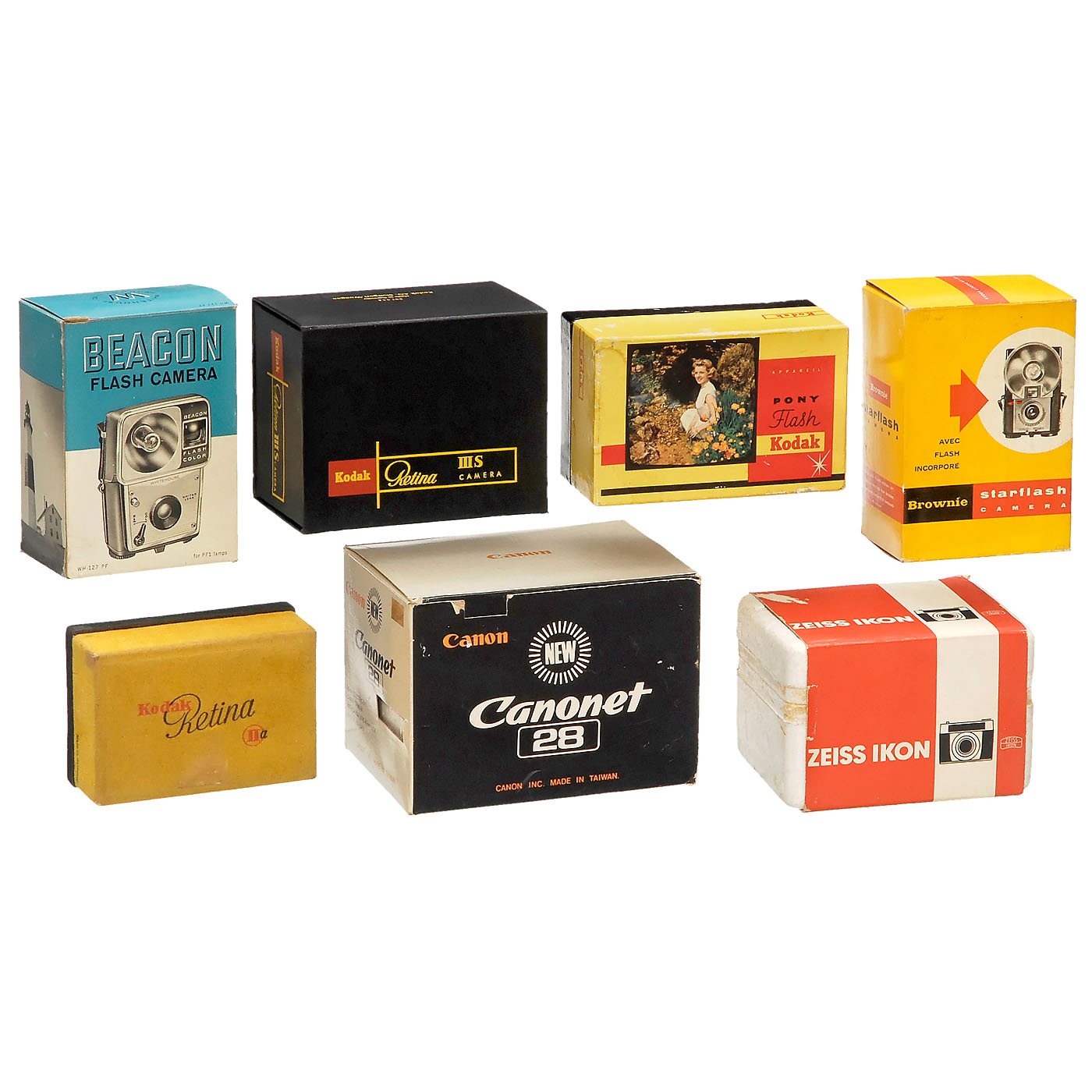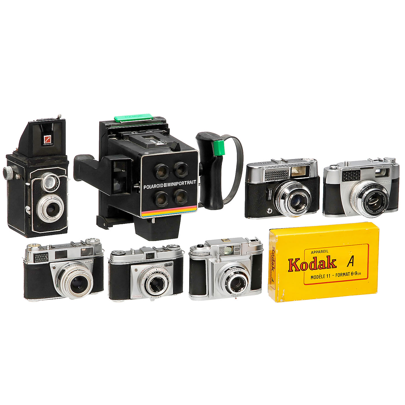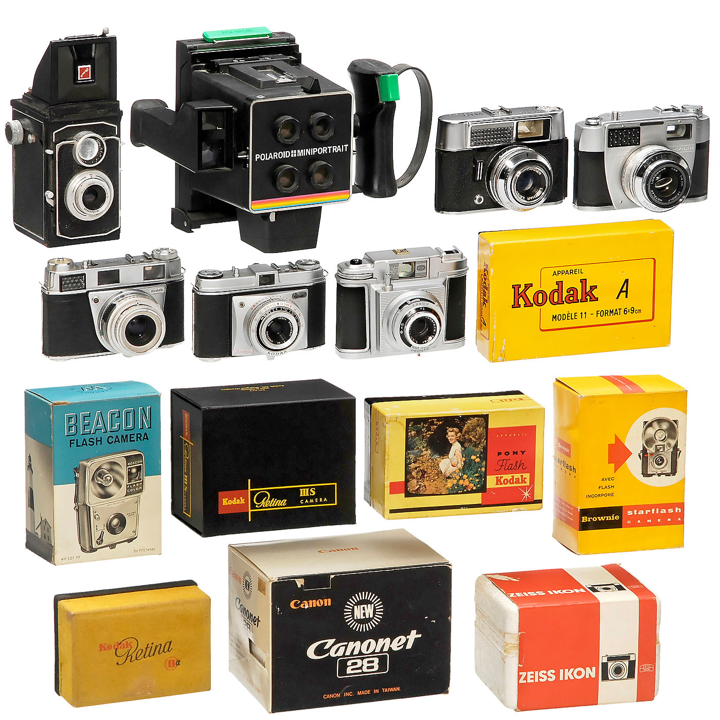 Kodak Retina Ia, Brownie Starlet II, Kodak A model 10, Instamatic 314, Pony Flash Kodak, Brownie Starflash, Photina TLR 6 x 6, Vito automatic, Retinette f, Leidolf auto Malik, Bilora 4 x 4, Yashica Campus, Polaroid Miniportrait, Canonet 28, Contina, Agfa cameras and more. – Not tested and not all pictured.