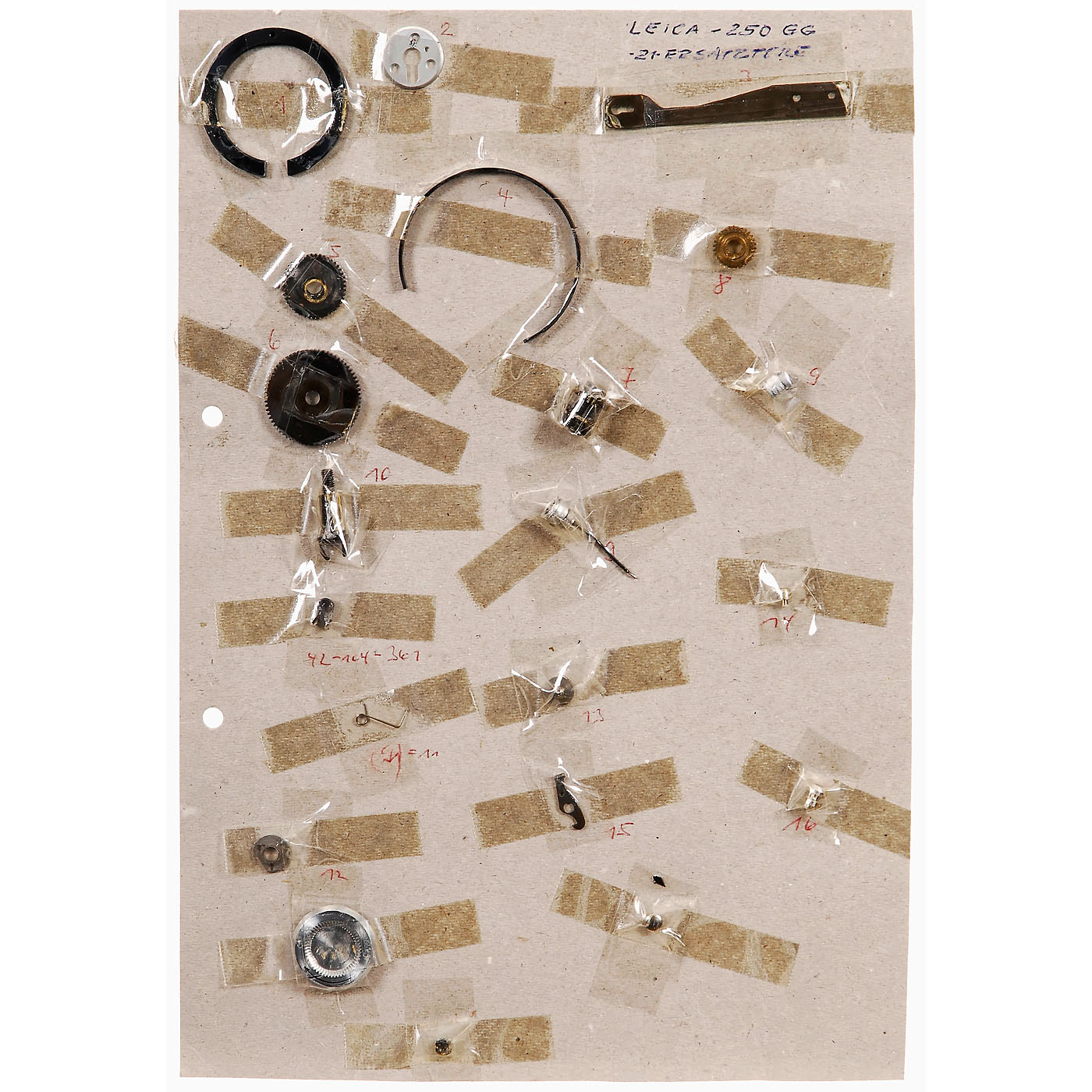 1) Universal bellows I UXOOR. – 2) Visoflex I with 5x loupe OZYXO and LVFOO, and other loupe. – 3) Leitz double cable release. – 4) Ring DOORX. – 5) Screw-mount ring. – And: 6) 2 copy tripods I and II for Elmar 5 cm (1 with lens). – In addition: Tableau with parts for Leica 25066.