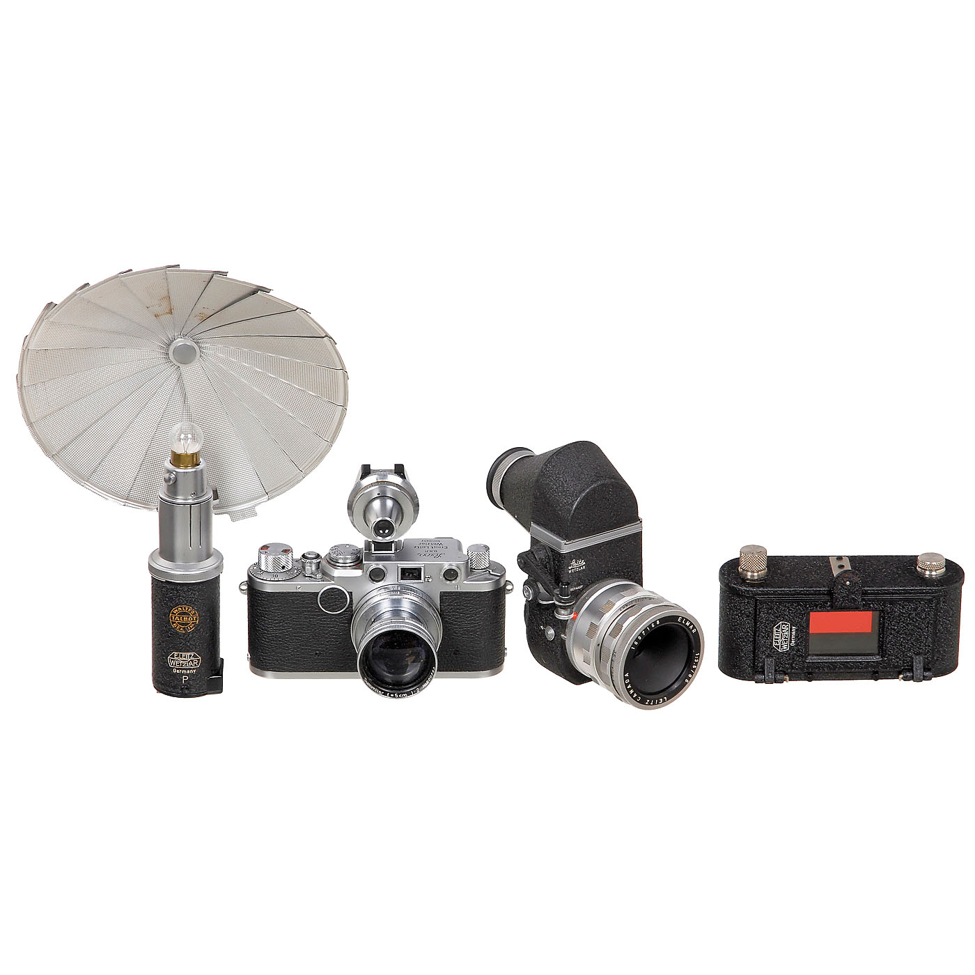 Leitz, Wetzlar. 1) Leica IIf, no. 574428, red-dial synchronization, shutter speeds all the same, everything else in excellent condition. With Summitar 2/5 cm, no. 900753, case and lens cap. – And: 2) Accessories: VIOOH universal viewfinder (sloped type), engraving "8,5 cm". Visoflex II with 4x magnifier OTXBO and Elmar 3,5/65 mm, no. 1697168, CEYOO flash with box. – In addition: Leitz slide printer Eldia, with damaged box.