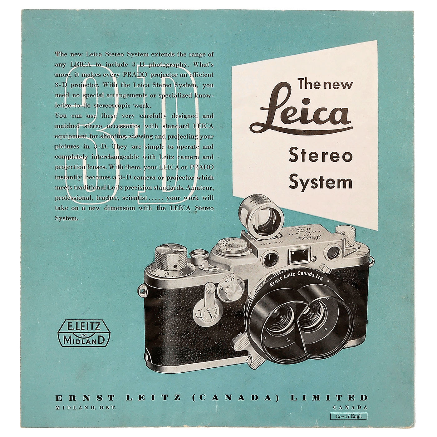 Leitz, Canada. Complete system for stereo exposures with M Leica OIRZO, Stemar 3,5/3,3 cm, no. 1124278, original box, prism attachment OIMPO with flap and rear cap (coating slightly patchy), brightline finder OIDYO, lens hood OIEGO and stereo viewer OTHEO with original box.