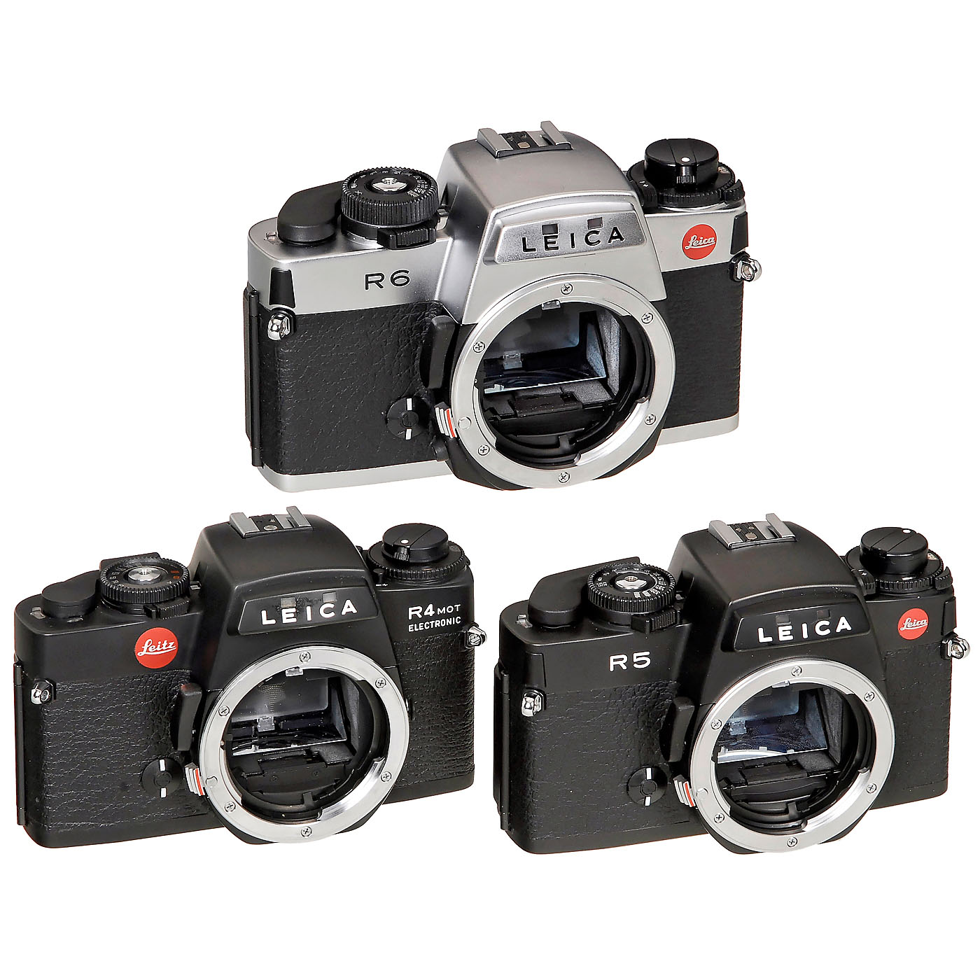 1) Leica R4 Mot Electronic, no. 1540846, body cap. (2–3/2) – 2) Leica R5, black, no. 1764284, body cap, excellent condition. (2/1) – And: 3) Leica R6, chrome, no. 1772297, body cap, excellent + condition, near mint! (1-/1)
