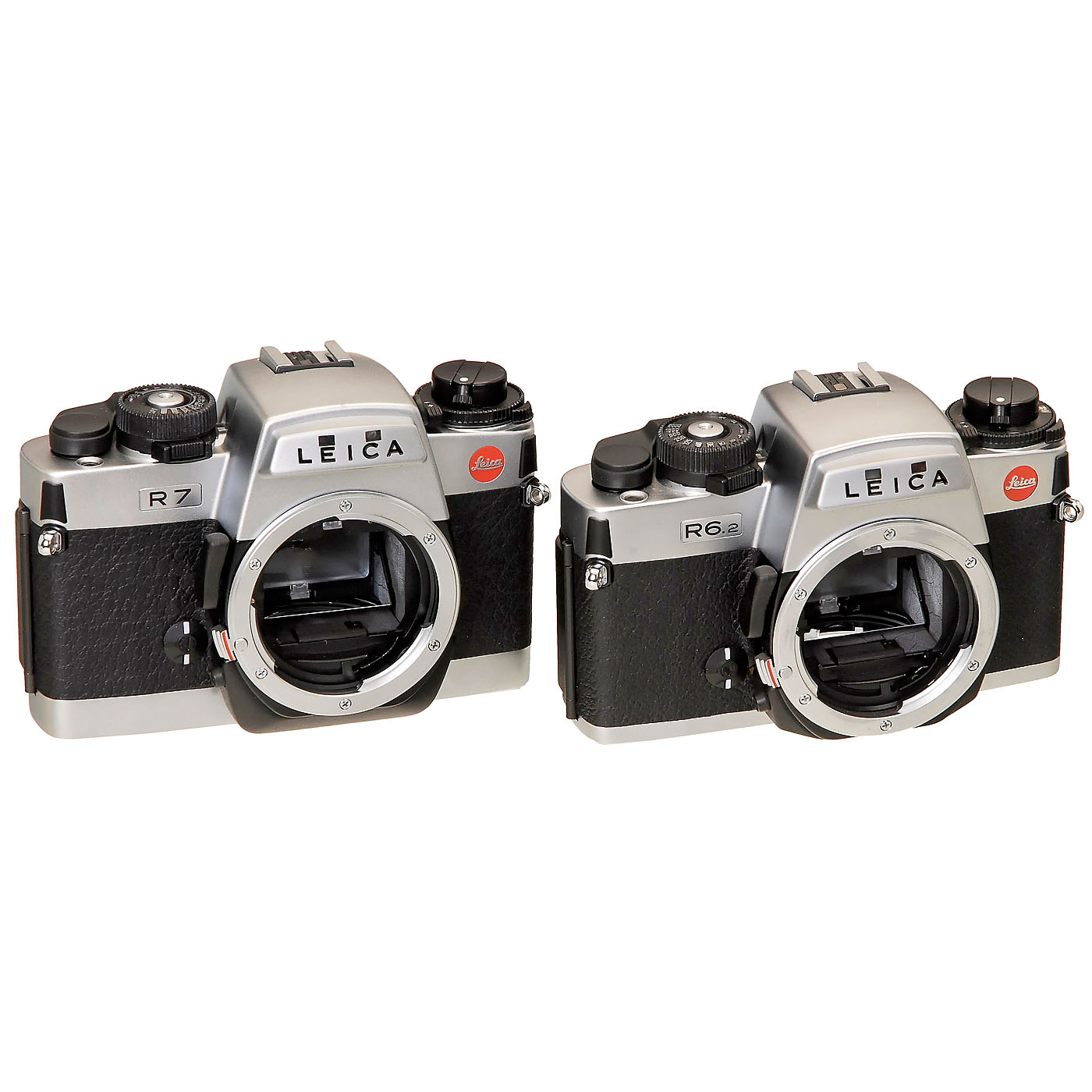 Leica Camera GmbH, Germany. 1) Leica R6.2, no. 1997795, chrome, body cap. Near-mint! – And: 2) Leica R7, no. 1919554, chrome, body cap. Also near-mint!