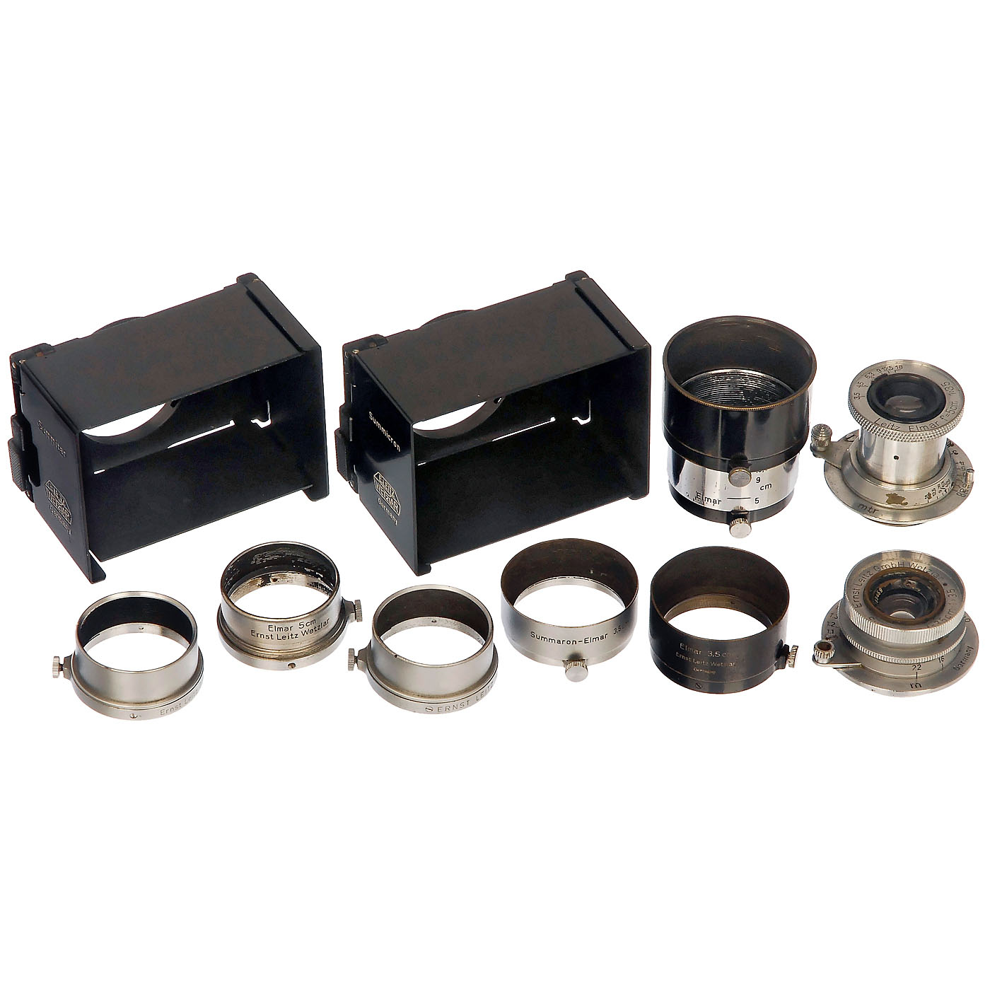 Leitz, Wetzlar. 1) Summaron 3,5/3,5 cm, no. 1283459. (3–4/3) – 2) Elmar 3,5/5 cm, no. 428168. (3–4/3). – Lens hoods: 3) SOOPD "Summitar". – 4) SOOFM "Summicron". – 5) FOOKH/12505. – 6) FLQOO, rare! – 7–9) 3 x FISON/12510, various engravings. – And: 10) FIKUS/12530.