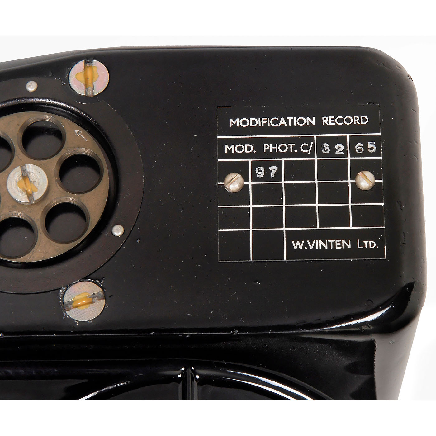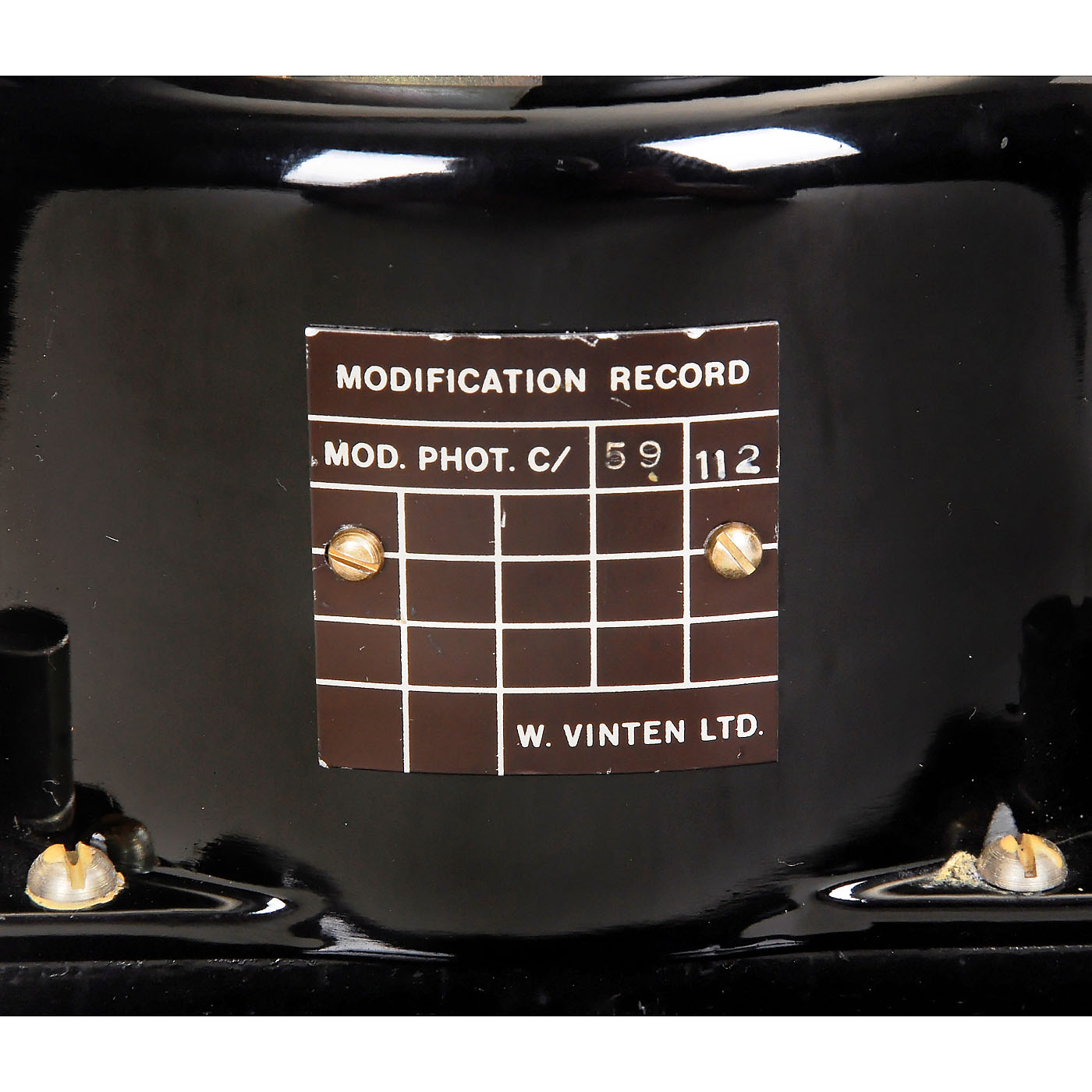 W. Vinten Ltd., London. Air camera for double-sided perforated 70mm film, with special lens Taylor Taylor & Hobson 4/12 in., camera type F.95 Ref. No. 14A/4556, body no. 629. With 70mm magazine MK IIa No. 5645, camera without electric cable. – Camera body in excellent outer condition, near-mint.