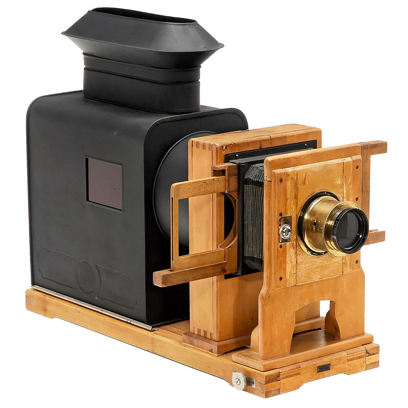 Ica, Dresden. Enlarger and projector, with slider for two glass plates of 9 x 12 cm, electric illumination, back board not complete, brass lens by Emil Busch Rathenow, without rack-and-pinion focusing, height of the projector 20 in.