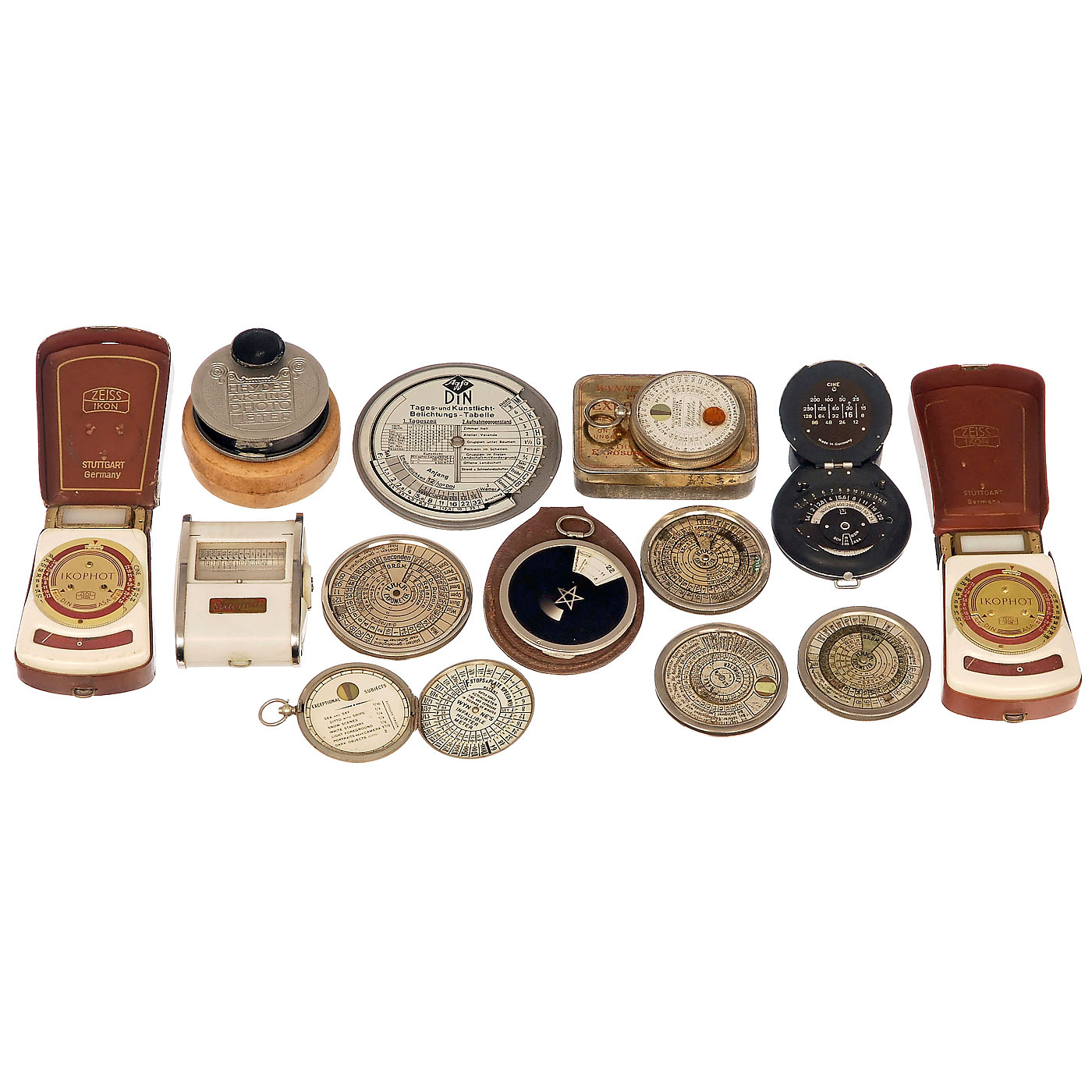 1) Heydes Aktino Photometer, with original cardboard box. – 2) Wynne's Infallible Exposure Meter, with original tin box and instructions. – 3) Wynne's Infallible Hunter Meter (watch-form). – 4) Bertram Chronos. – 5–6) 2 x Zeiss Ikon Ikophot. – 7) Gossen Sixtomat. – 8) Rare Zeiss Ikon "Kidiaphot" (light meter for movies), with case. – 9–12) 4 x Haka Expometer (assorted). – And: 13) Agfa exposure table.