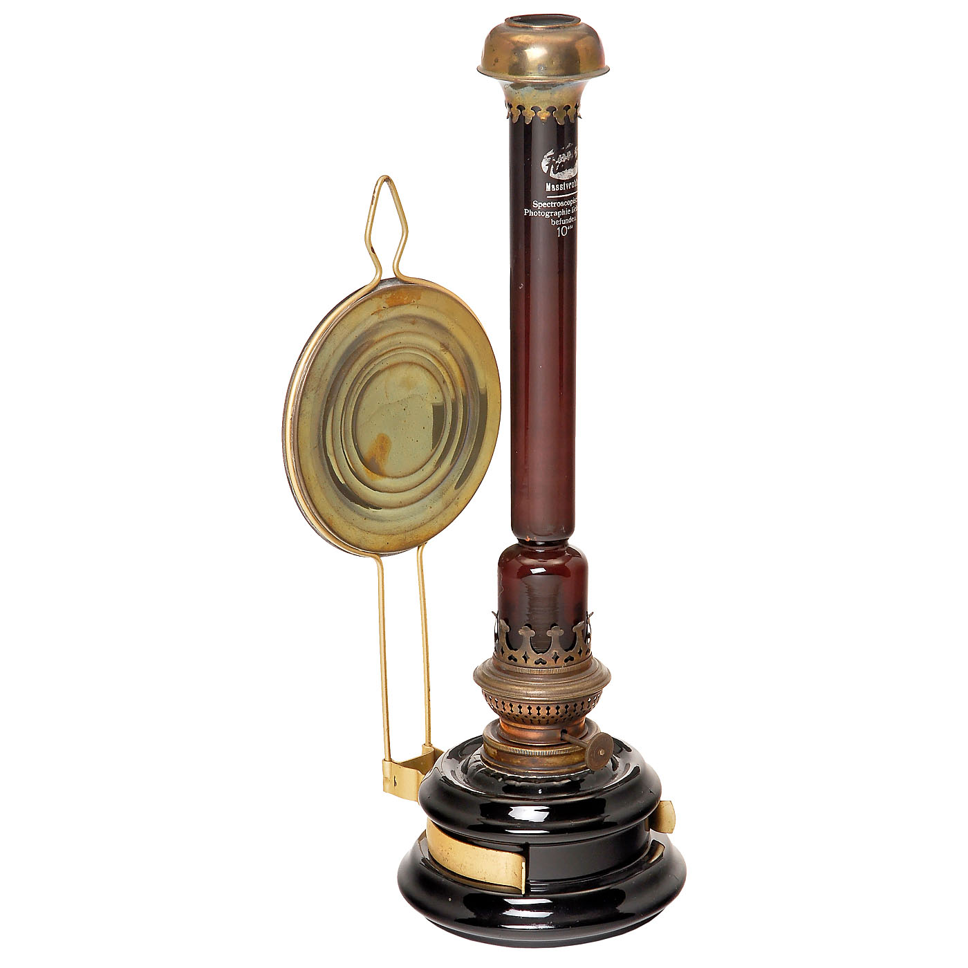 Unmarked. Brown petroleum glass tank, brass burner and cover, height 15 in., ruby-red "chimney".