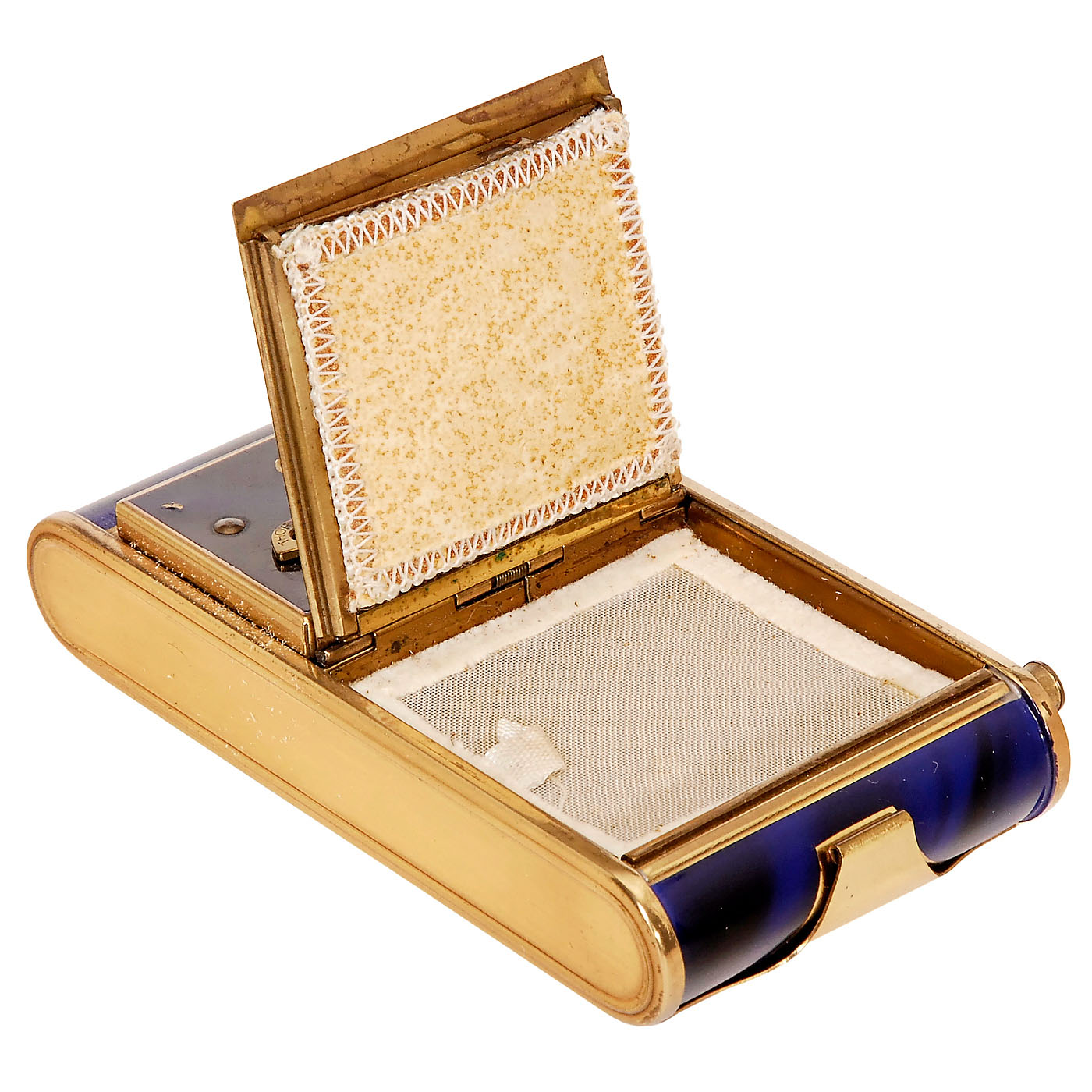Cigarette case in form of a Kodak Vest-Pocket camera. Brass body with blue-lacquered decoration, one side a cigarette box, the other with powder box and musical movement by Thorens, Switzerland (working), size: 4 x 2 x 3/5 in. – Very rare combination of a "Camera-Pack"!