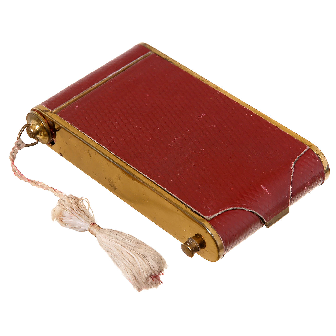 Brass body with red leather covering, size 4 x 2 x 3/5 in. – Rare!