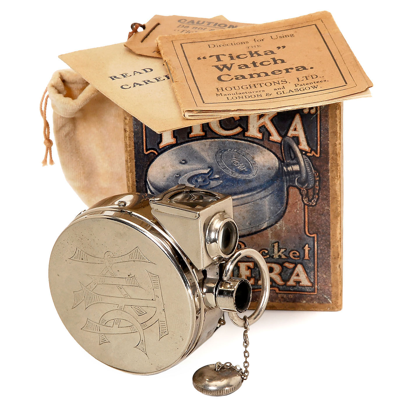 Houghton's Ltd., London. For 25 photographs of 16 x 22 mm on special cassette, meniscus lens, shutter I + T, chrome-plated version. Complete with original viewfinder, lens cap, instruction manual in English and maker's card box. – Near-mint condition!