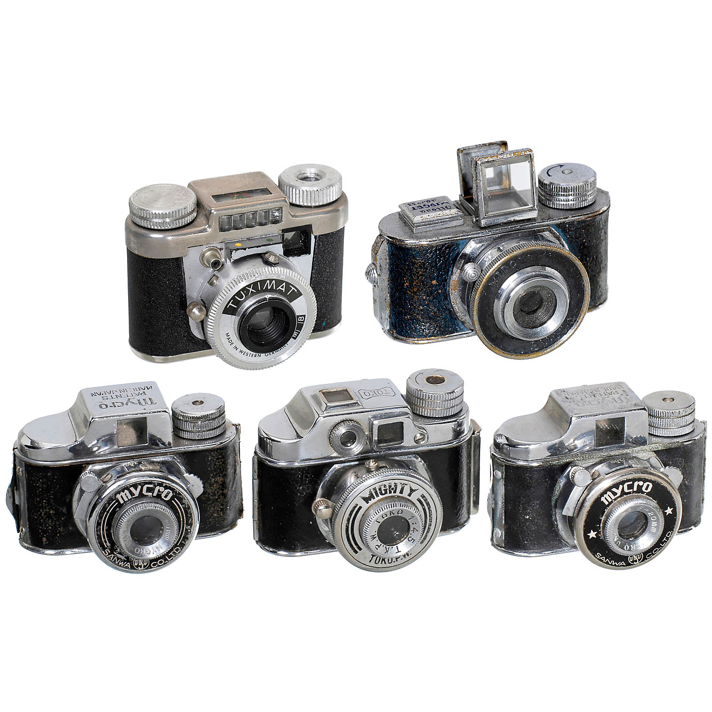 1) Toyo Kogaku, Japan. Mighty, c. 1948, "Made in occupied Japan", size 14 x 14 cm, Toko 4,5 lens, I. + B., with case. (2-/3+) – 2–3) Sanwa Shokai Ltd., Japan. 2 x Mycro (various), 1950, size 14 x 14 cm, Mycro Una 4,5/20 mm, 1/25–1/100 sec., 1 ocular missing, 2 cases. (3/3) – 4) Walter Kunik, Frankfurt/a.M. Tuximat, 1959, size 14 x 14 mm, Röschlein, 7,7/25 mm, M. + B., built-in light meter (not working), original case. (3/4) – And: 5) Misuzu Trading Co. Ltd., Japan. Midget Jilona (I), c. 1937, size 14 x 14 mm, fixed focus lens, I. + B., body no. 1233. Extremely rare and early subminiature camera from Japan! (3-/2-)