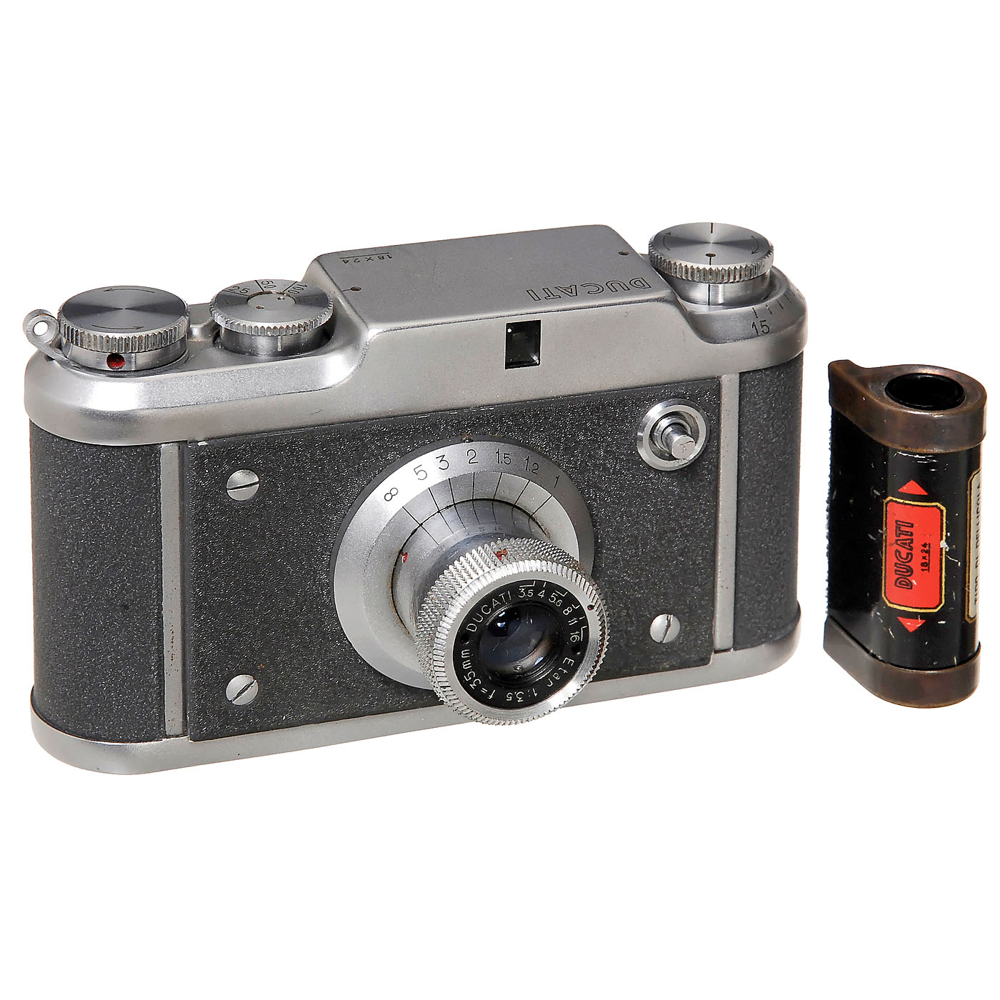 Ducati, Milan, Italy. For 18 x 24 mm images on 35mm film. With Ducati Etar 3,5/35 mm, focal plane shutter 1/25–1/250 sec. (sluggish). Body no. 14227. Here the rarer version of the two Ducati "brothers".