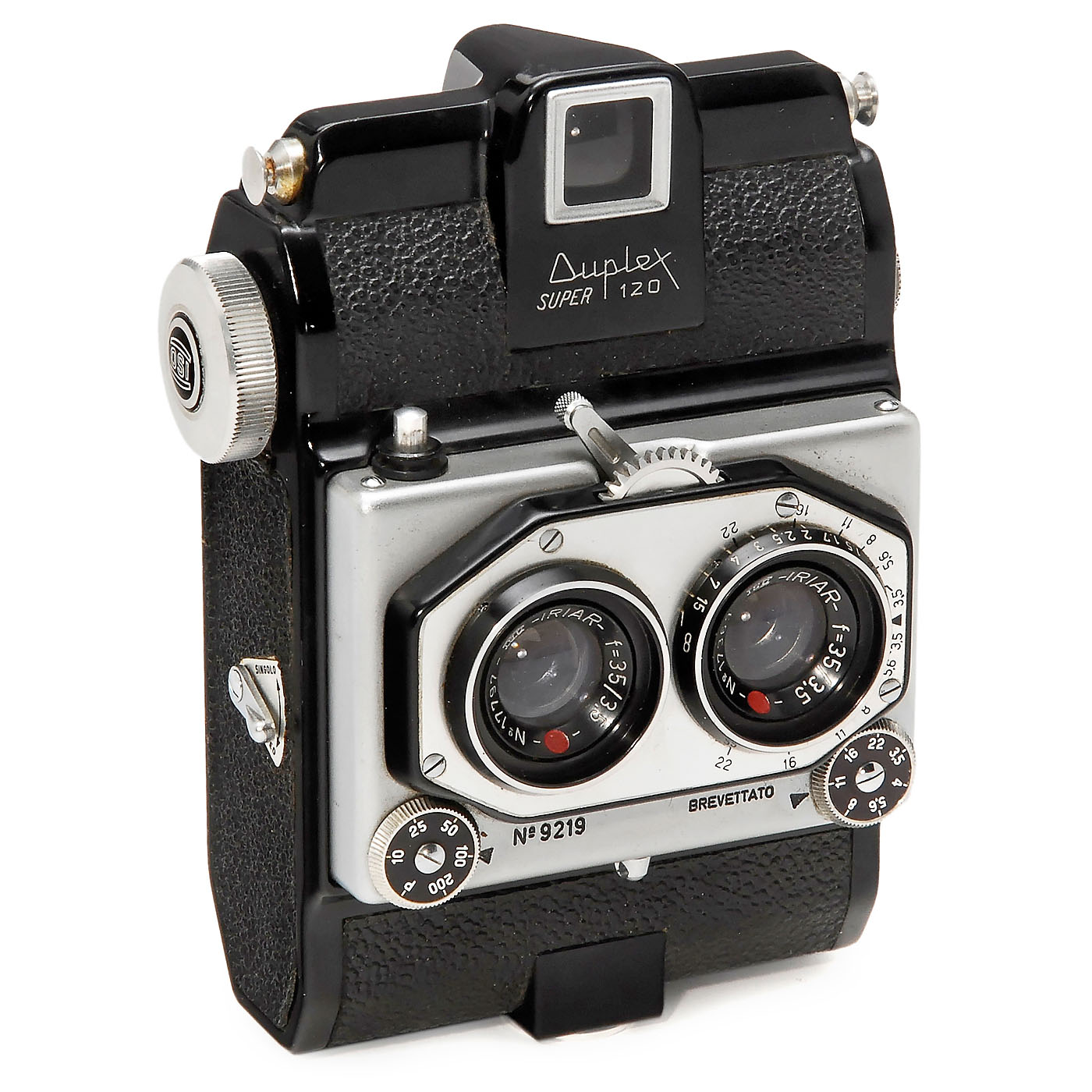 Industria Scientifica Ottica, Milan. Stereo camera for rollfilm 120, for 2 stereo pictures of 24 x 23 mm, lenses: ISO Iriar 3,5/35 mm, diaphragms 3,5–22, guillotine shutter P, 1/10–1/200 sec., focusing 1 m to infinity by movement of the front lenses, Gali