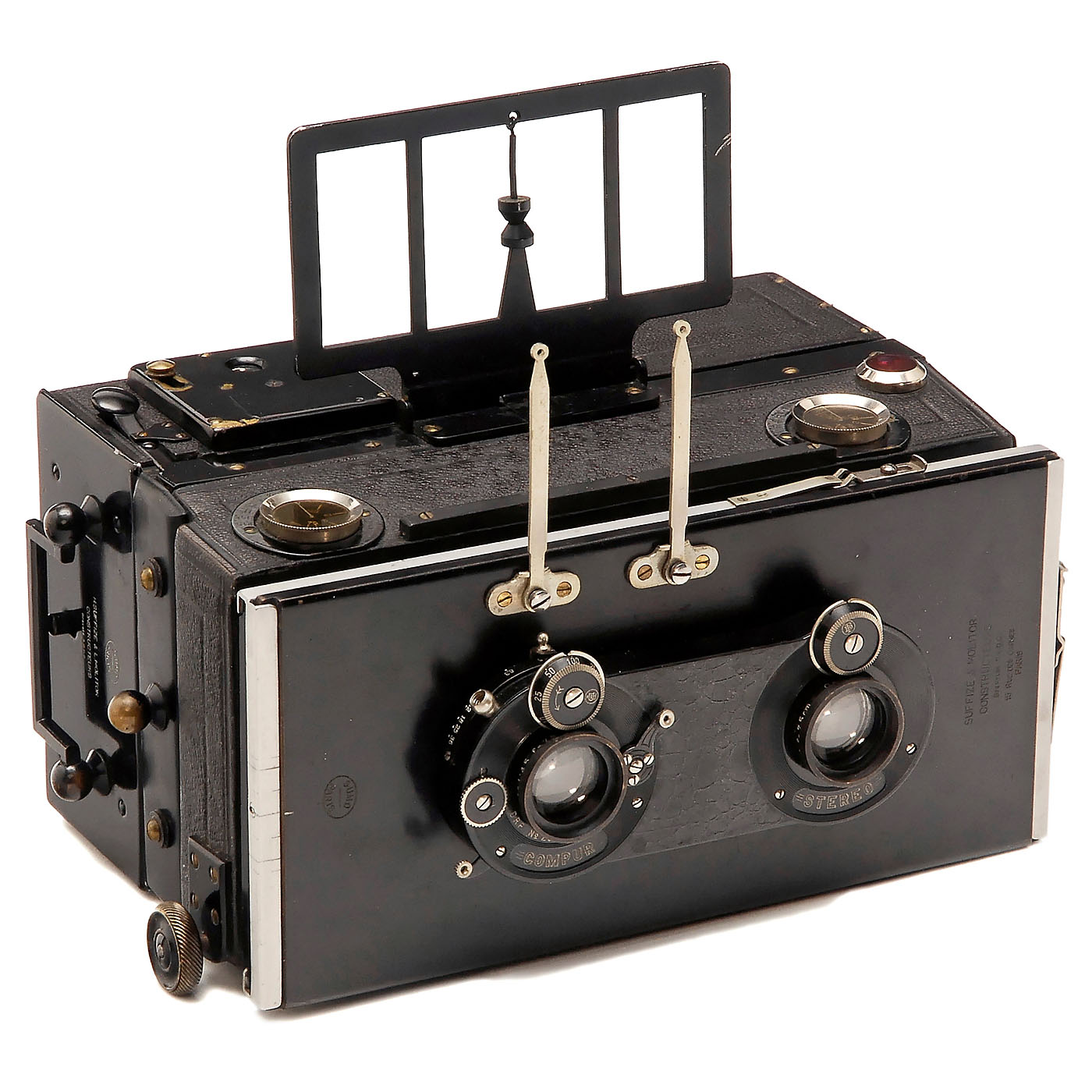 H. Suffice et L. Molitor, Paris. Stereo-panorama camera for plates of 6 x 13 cm, lenses: Carl Zeiss Jena Tessar 4,5/7,5 cm, shutter: Stereo Compur Z, D, 1–1/250 sec., rack-and-pinion focusing 1,5 m to infinity. For panoramic pictures, one lens can be moved into the center, moving the septum aside automatically. With folding frame finder with plumbline, magazine for plates.