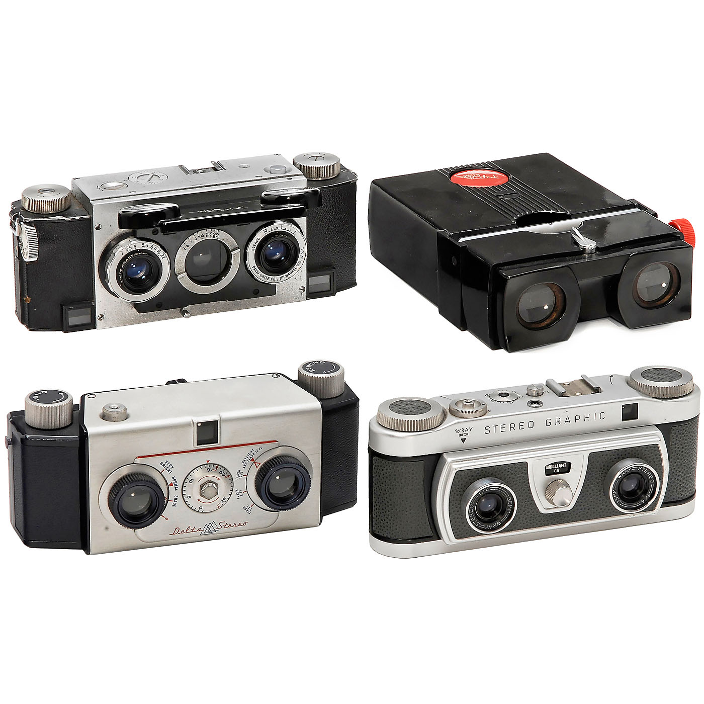1) White, Milwaukee. Stereo Realist 3,5 (model 1041), 1947, no. A54825, Anastigmat 3,5/35 mm, shutter 1–1/150 sec. – In addition: Realist stereo viewer (battery-operated). – 2) Wray, London. Stereo Graphic, c. 1956, size 24 x 23 mm on 35mm film, lenses: Wray-Stereo 4/35 mm, shutter I + B. – And: 3) Delta Stereo, Chicago. Delta Stereo, 1955, size 24 x 23 mm on 35mm film, Le Croix 6,3/50 mm, guillotine shutter.