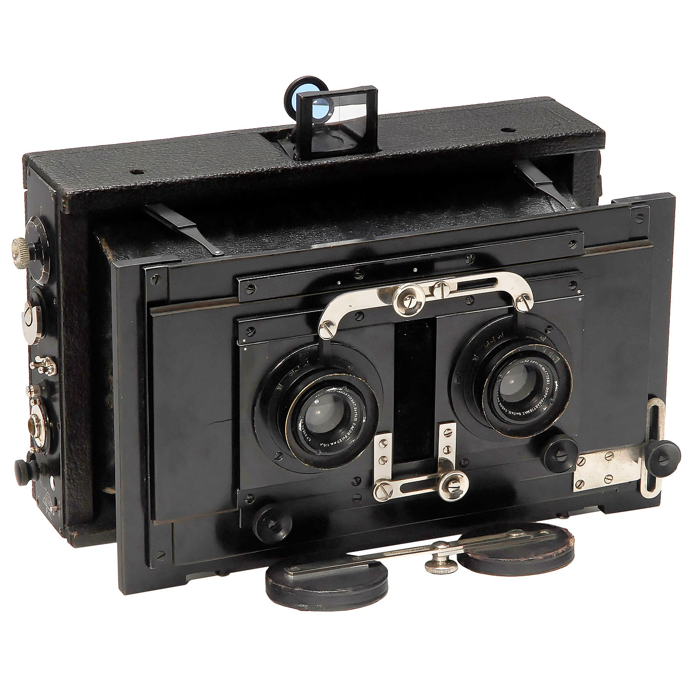 C.P. Goerz, Berlin. Strut-folding stereo camera for plates of 9 x 18 cm, lenses: Goerz Anastigmat Serie III Dagor 6,8/120 mm, iris diaphragms 6,8–192, focal plane shutter (Anschütz) sluggish, focus adjustment from 2 m to infinity, lens separation adjustable from 65 to 80 mm, Newton viewfinder, with ground-glass back and 3 double plate holders 9 x 18 cm.