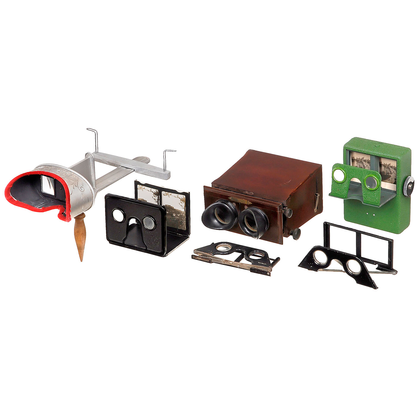 1) Stéréoscopes, Paris. Planox, c. 1920, for stereo slides of 6 x 13 cm, mahogany, focusing oculars, interocutar adjustment, screen new. (3/2) – 2) H.C. White Co., USA. "The Perfecscope", c. 1895, Holmes-pattern, hand-held stereo viewer for cards of 9 x 18 cm. – 3) Pendoplast, Stuttgart. "Pendoplast", c. 1930, for stereo cards of 7,5 x 11 cm, metal body with green stamped finish. (3/3) – 4–5) 2 "Raumbild" stereo viewers for 6 x 13 cm cards (1 glass missing). (3/5) – And: 6) Stereo Indupor GmbH, Frankfurt. Folding stereo viewer for stereo pictures of 8,5 x 11,5 cm, with 6 pictures. (3/3)
