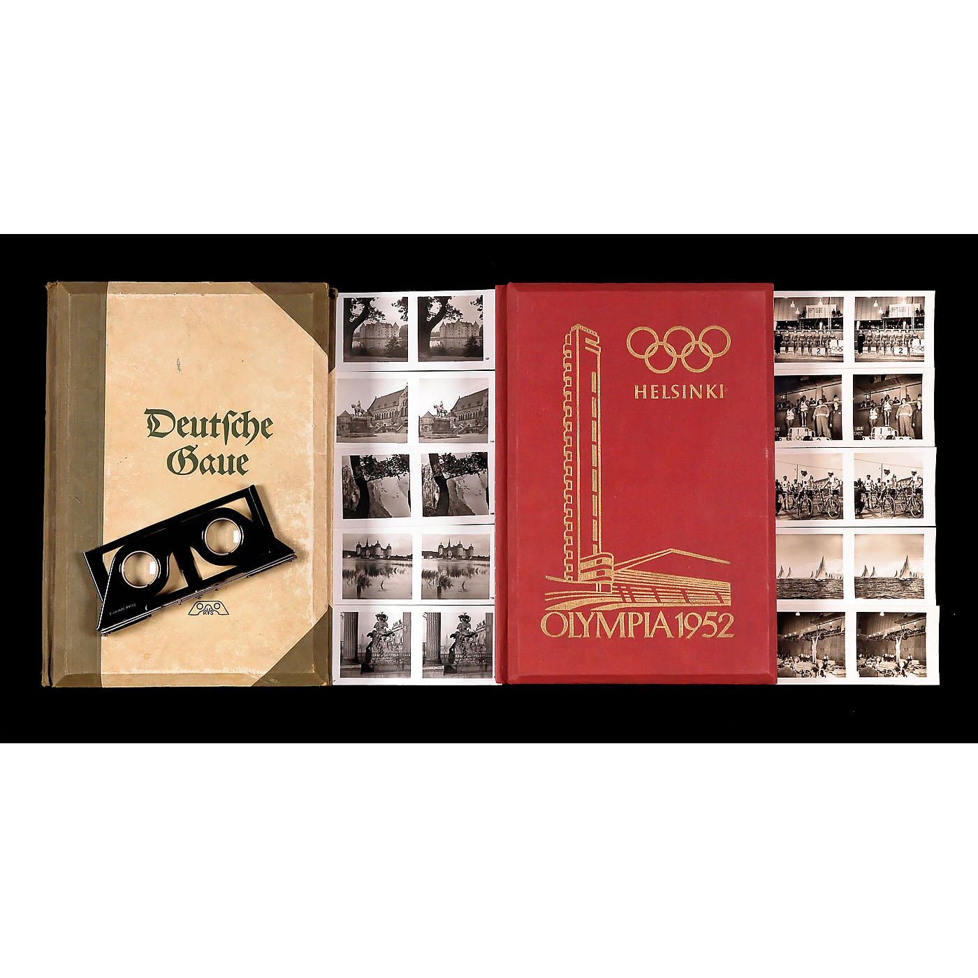 Raumbild-Verlag Otto Schönstein, Munich. 1) "Deutsche Gaue", 1938, 192 pages, with 200 stereo pictures, complete, picture size 6 x 13 cm, with stereo viewer. – And: 2) "Helsinki – Olympia 1952", 110 pages, with 97 stereo pictures, missing no. 22–24, picture size 6 x 13 cm, with Raumbild stereo viewer (later).
