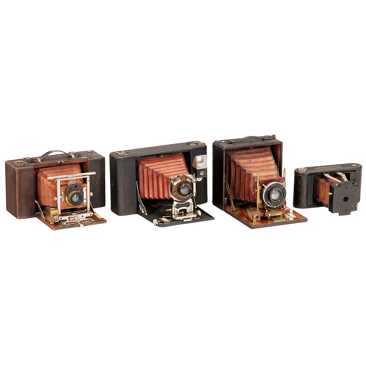 Cameras made by: Kodak, Krügener, Ernemann, ICA, Ansco, Orionwerk, Monroe and others. 1) No. 5 Cartridge Kodak. – 2) No. 4 Cartridge Kodak. – 3) No. 2 Folding Brownie. – 4) No. 4 Folding Hawk-Eye Model 3. – 5) No. 3A Folding Pocket Kodak. – 6) No. 1 Folding Pocket Kodak. – 7) No. 2A Folding Rainbow Hawk-Eye Special, green. – 8) No. 2A Folding Cartridge Hawk-Eye. – 9) Jiffy Kodak Six-20 Series II. – 10) Krügener Delta Cartridge 10 x 12,5. – 11) Ernemann Bob. – 12) ICA Orix 308. – 13) No. 10 Ansco Model B. – 14) Orionwerk Rio 79 C. – 15) Monroe No. 4. – And: 16) 2 other unmarked plate cameras.