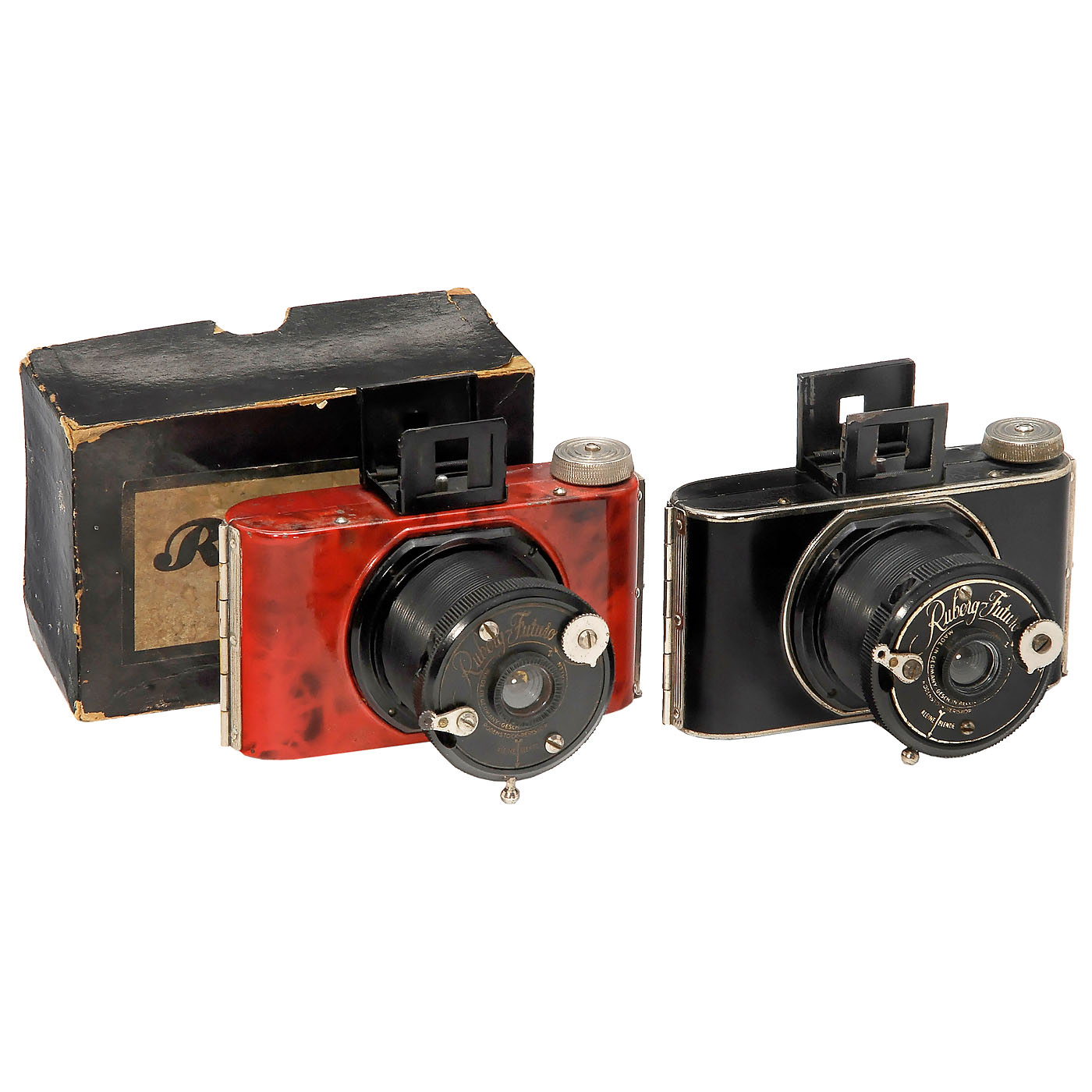 Ruberg & Renner, Hagen, Germany. 4 x 6 and 6 x 6 cm on film type 127, 1 with original red/black décor-lacquer and 1 with black décor-lacquer. Red version not working, 1 with original box. – Sought-after cameras!