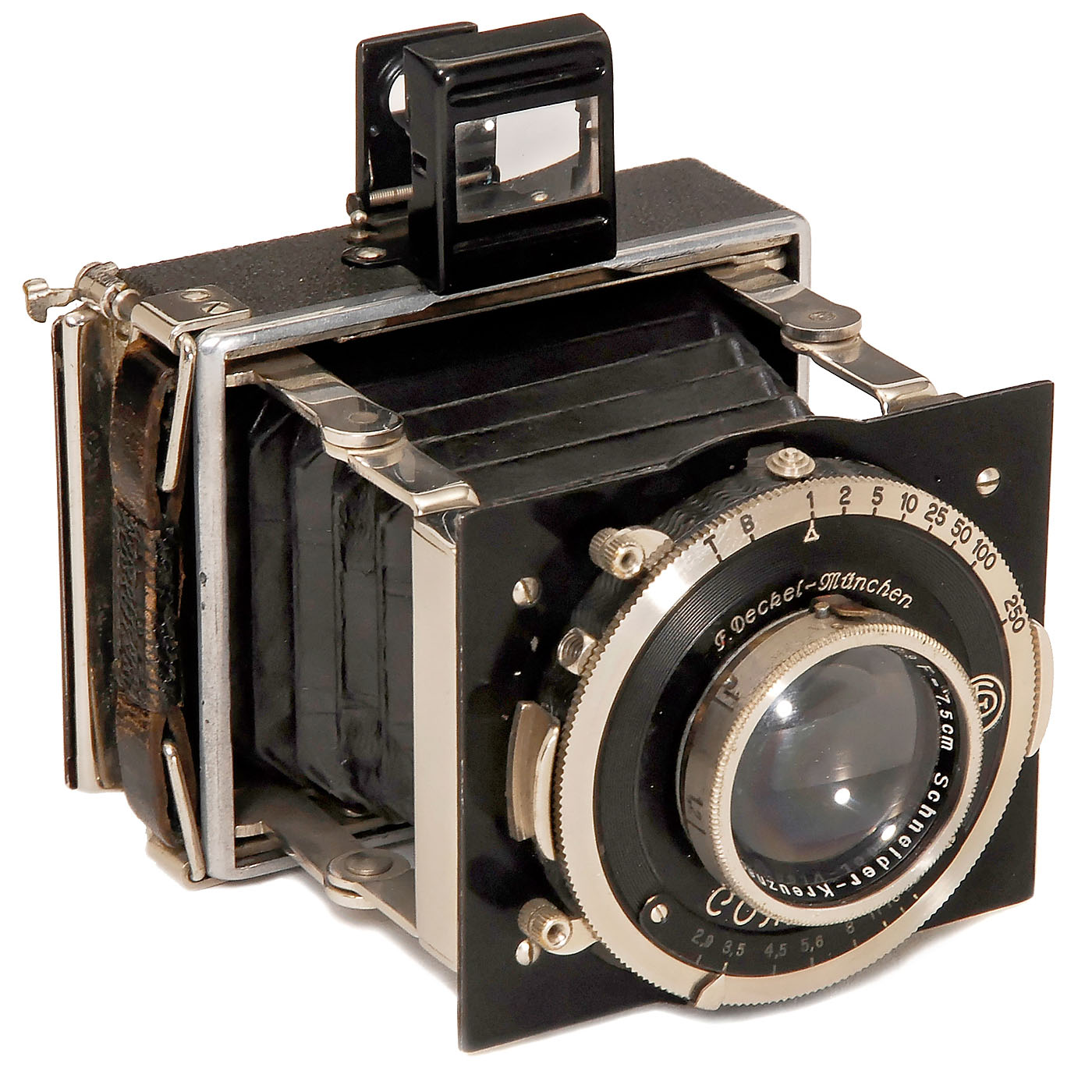 Franz Kochmann, Dresden. Strut camera for plates of 4,5 x 6 cm, Radionar 2,9/7,5 cm in rim-set Compur, focusing screen back. Excellent ++ condition. – Sought-after camera for 4,5 x 6 cm!