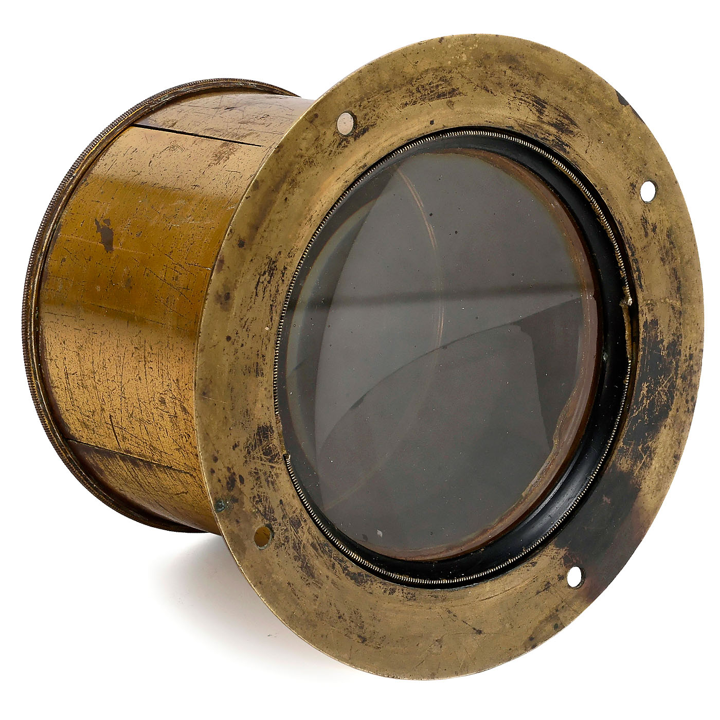 Unmarked daguerreotype lens with construction characteristics of "Susse Frères" lens. Focal length approx. 380 mm, height of the lens 81 mm (3 1/5 in.), picture size approx. 16 x 22 cm (6 ¼ x 8 ¾ in.), original Susse Frères picture size 16,7 x 21,6 cm. Glass diameter approx. 82 mm (3 ¼ in.), concave rear element. Front plate with "riffled" border and small dimple on plate border. With connecting ring Ø 4 4/5 in. – A "rough diamond" of a Susse Frères lens!