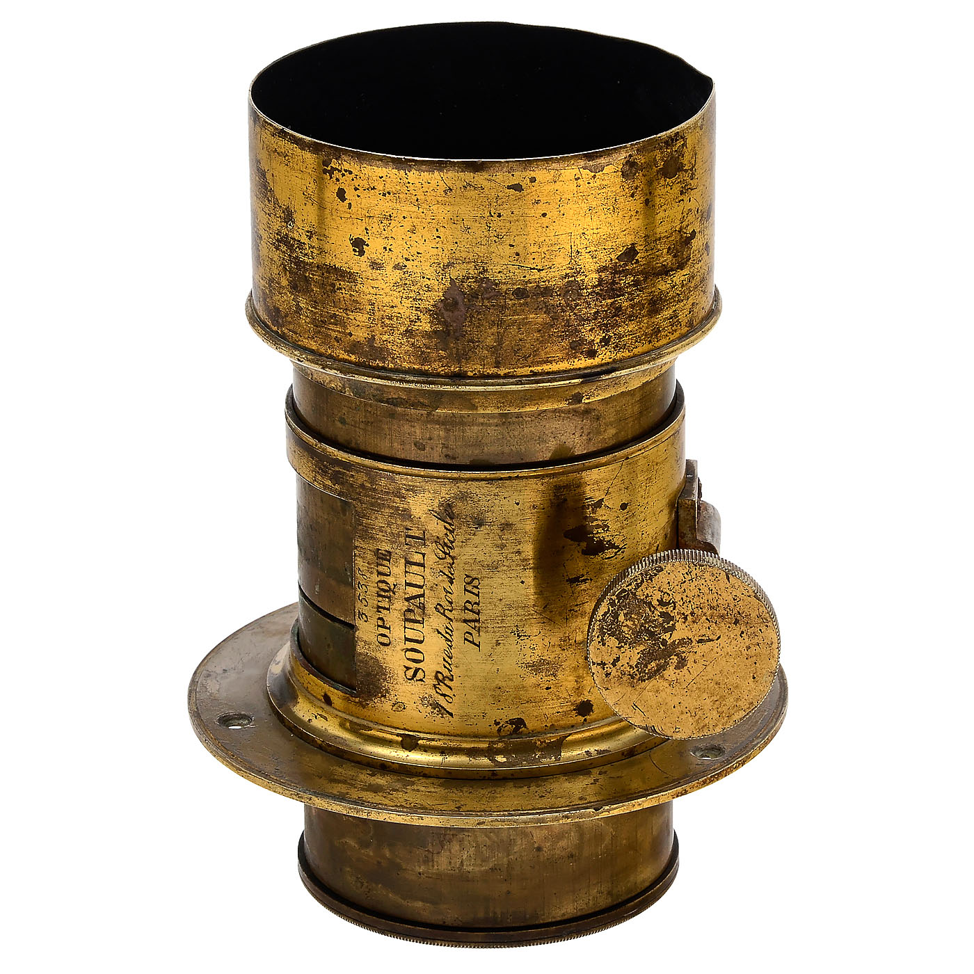 Optique Soupault, 18 rue du Roi de Sicile, Paris. Universal lens, approx. 20 cm focal length, no. 3538, waterhouse stop, height 6 in., rack-and-pinion focusing, connecting ring Ø 4 1/3 in. – Very rare lens by a small-scale French manufacturer!