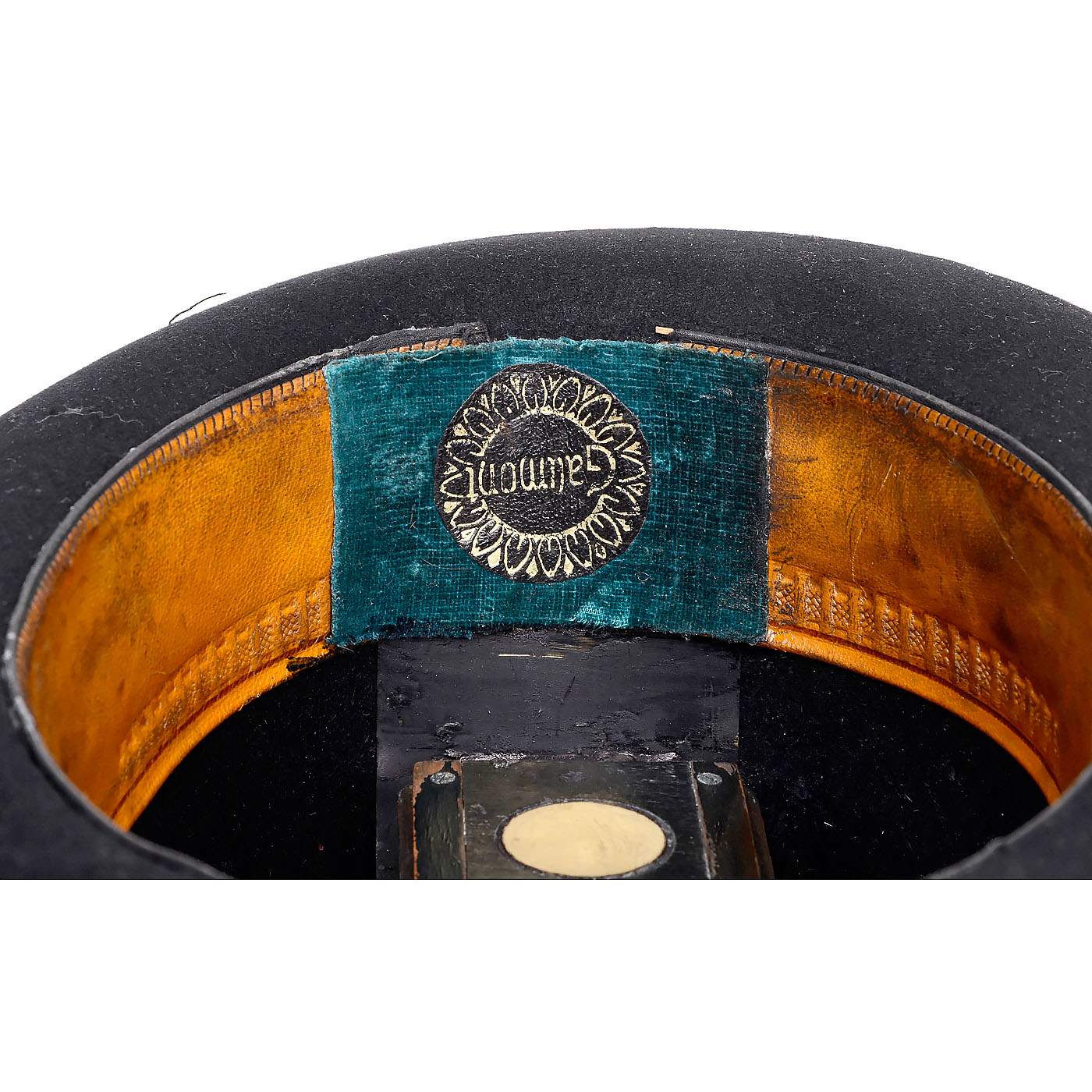 Bowler with built-in fixed plate camera for glass plates of 26 x 38 mm, guillotine shutter, released by pulling a cord hanging out at one side of the hat, fixed focus lens. Hat interior embossed: "The 'Ideal' Hat – Easy Fitting 6 ½" as well as a sticker "Gaumont". Size of the hat 11 ¾ x 9 x 6 in. With metal box. – Excerpt from "Antique Cameras '78" by Uwe H. Breker, Cologne: "Up to now, it has only been known from advertising and patents that various hat cameras must have existed in the second half of the last century. Therefore, this is the first time that a picture of an original hat camera can be shown."