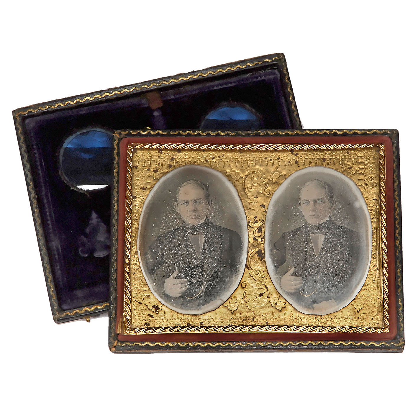 Presumably France. ¼ plate, portrait of a gentleman with piercing gaze, hand-tinted, case with floral pattern, spine loose, case with folding stereoscopic lenses.