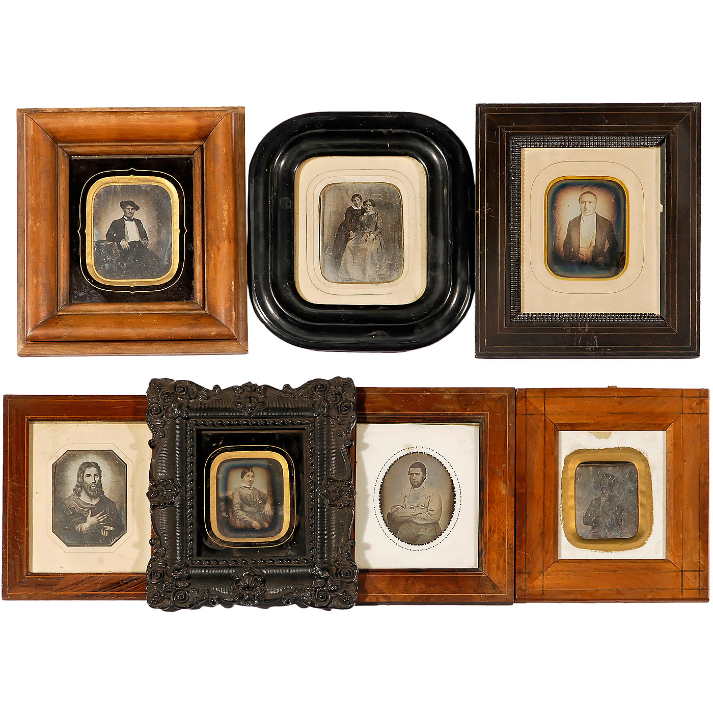 Predominantly French. 5 x ¼ plate, 2 x 1/6 plate, portraits, framed (but opened), mixed conditions.