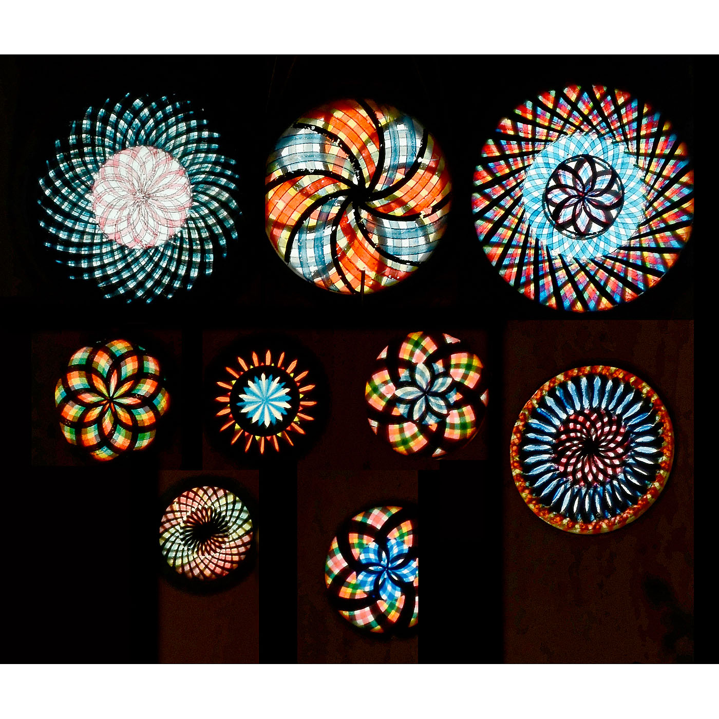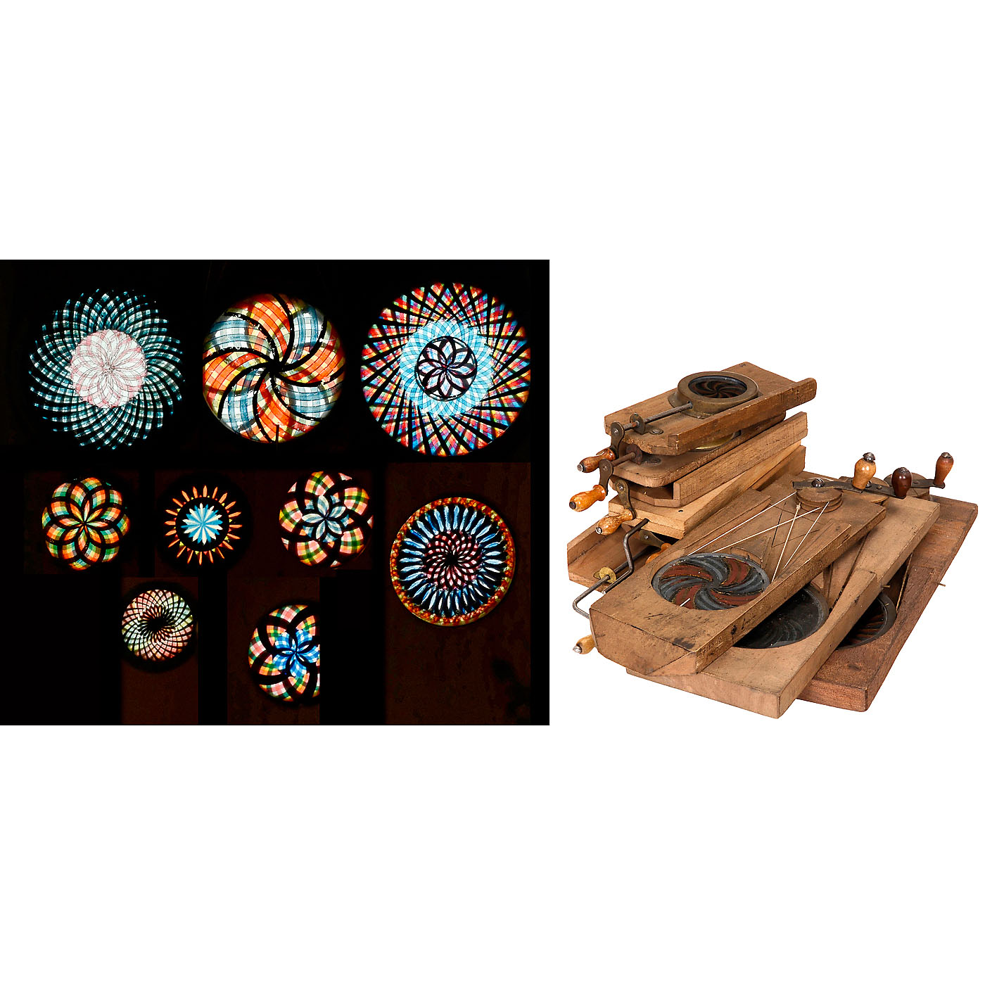 Various sizes and techniques. Wooden frames 1 ½ x 4 1/3 in., 2 x 4 1/3 in., 2 3/4 x 5 ½ in., 2 1/3 x 6 3/4 in., 3 1/6 x 7 ½ in. Prints and hand-colored chromatropes. All working well.