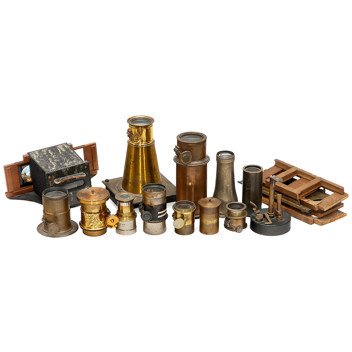 11 lenses, 5 sliders, spirit illuminant, magic lantern viewer.